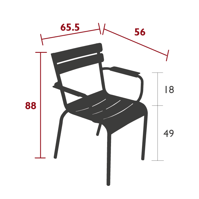 49 x 57 x H88cm Seat height: 49cm Armrest height: 66cm Seat depth: 65cm Frame: aluminum tube Seat: curved aluminum slats Back surface: curved aluminum slats Armrests: aluminum slats Noise-dampening gliders Stackable up to 8 pieces (stacking height in this case: 116cm) - Private use - professional use/Horeca - for public use