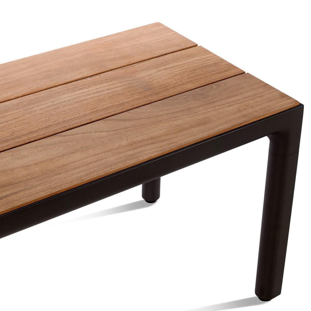 The frame made of die-cast aluminum is double powder-coated - this ensures optimal scratch resistance and UV resistance. By using teak for the seat, the rectangular bench is not only particularly delicate, but also extremely durable.