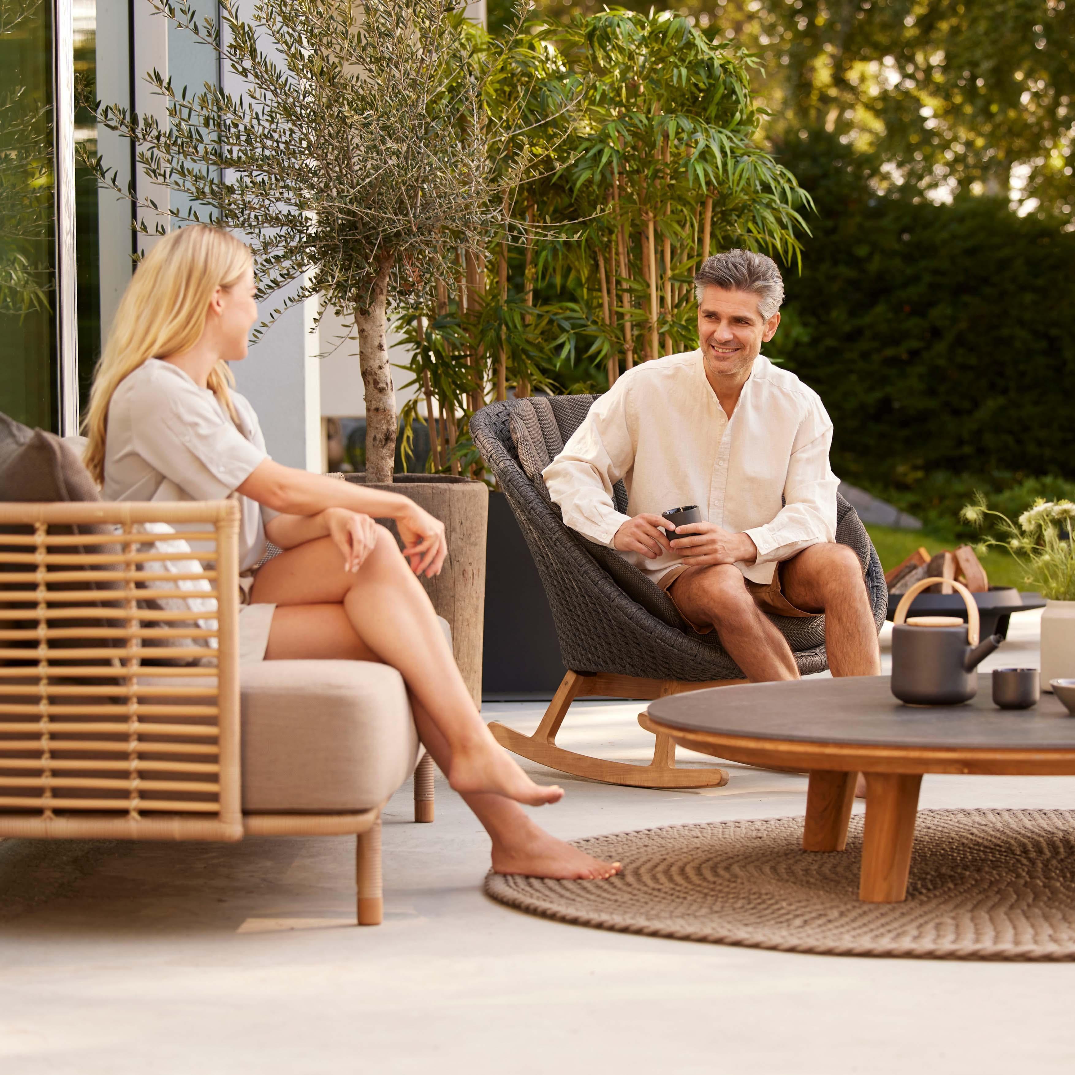 The ASPECT coffee table from Cane-line embodies Danish design excellence and brings natural elegance into your home. With a diameter of 144 cm, the table offers enough space for stylish arrangements, making it the centerpiece of your living area. The interlocking frame made of high-quality teak not only gives the table stability, but also a warm, inviting appearance. Teak is known for its durability and ability to withstand the elements, making the ASPECT coffee table the ideal choice for both indoors and outdoors.