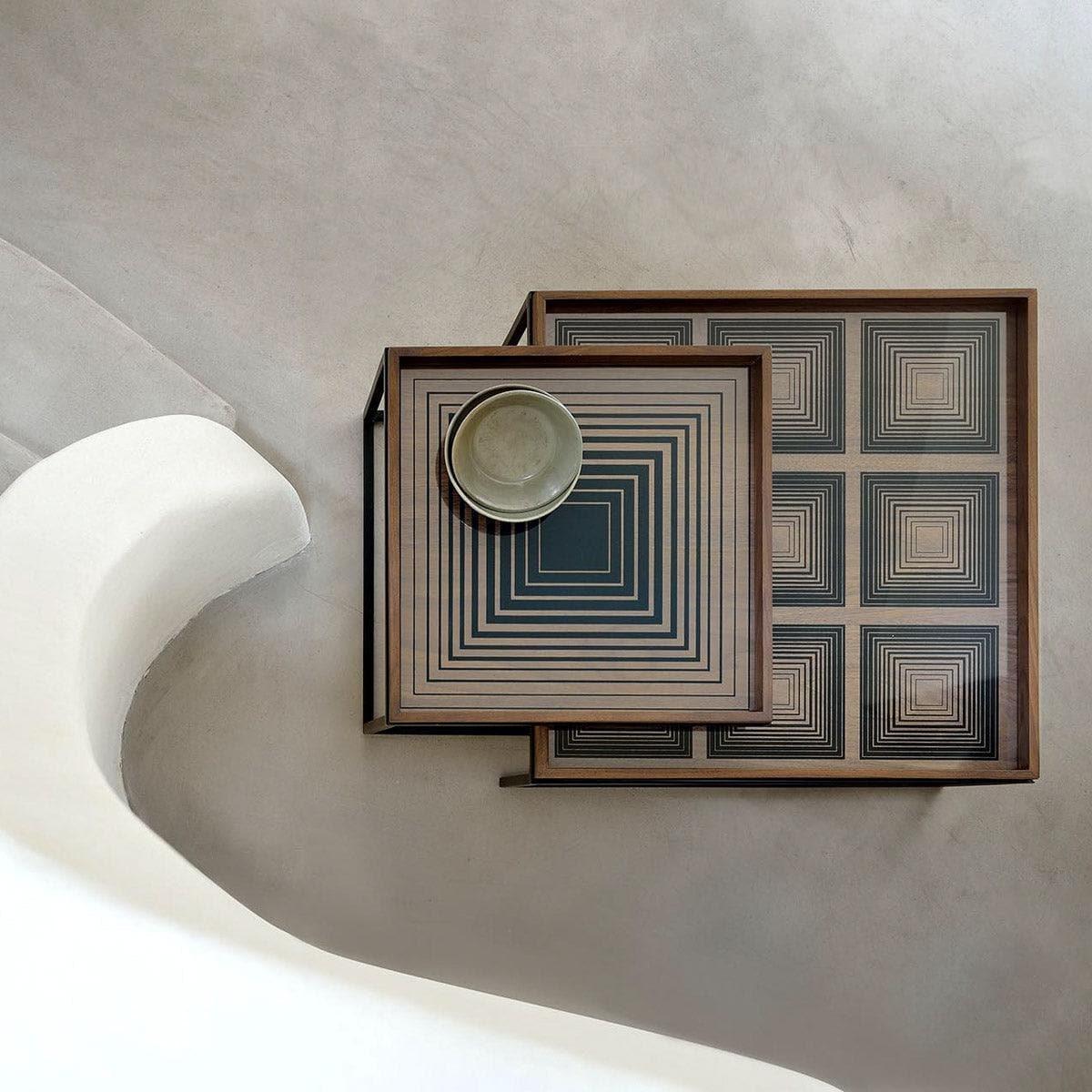 The special thing about this coffee table set is that you can customize it according to your preferences. Thanks to the specially designed recess in the frame of the larger table, the smaller table can be easily slid underneath, allowing you to create space or an attractive stepped look as required. The raised edges of the table tops provide a secure surface for trays, which are available in various shapes and sizes. These trays, designed by Dawn Sweitzer, can be purchased separately and allow you to mix and match colors and patterns to suit your taste.