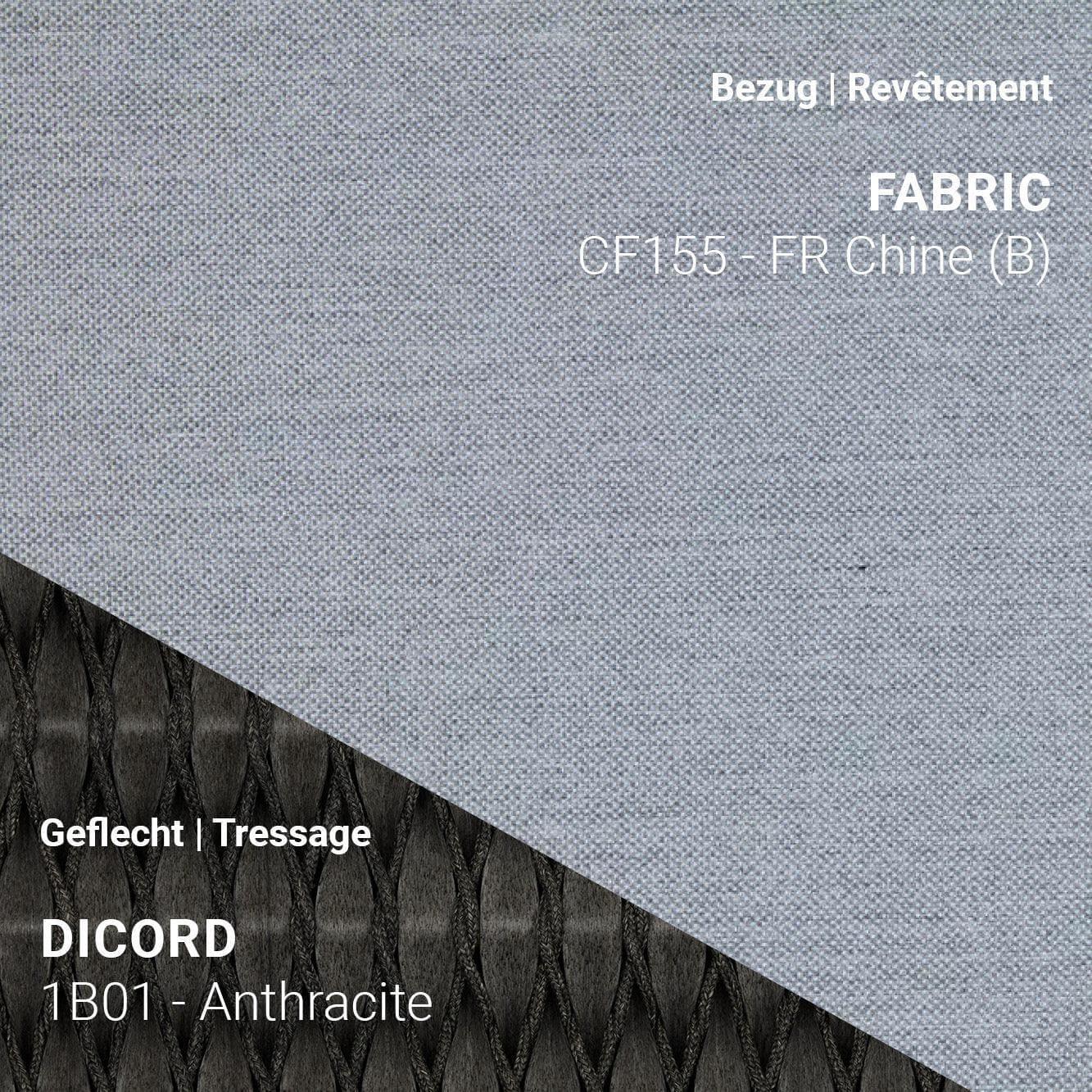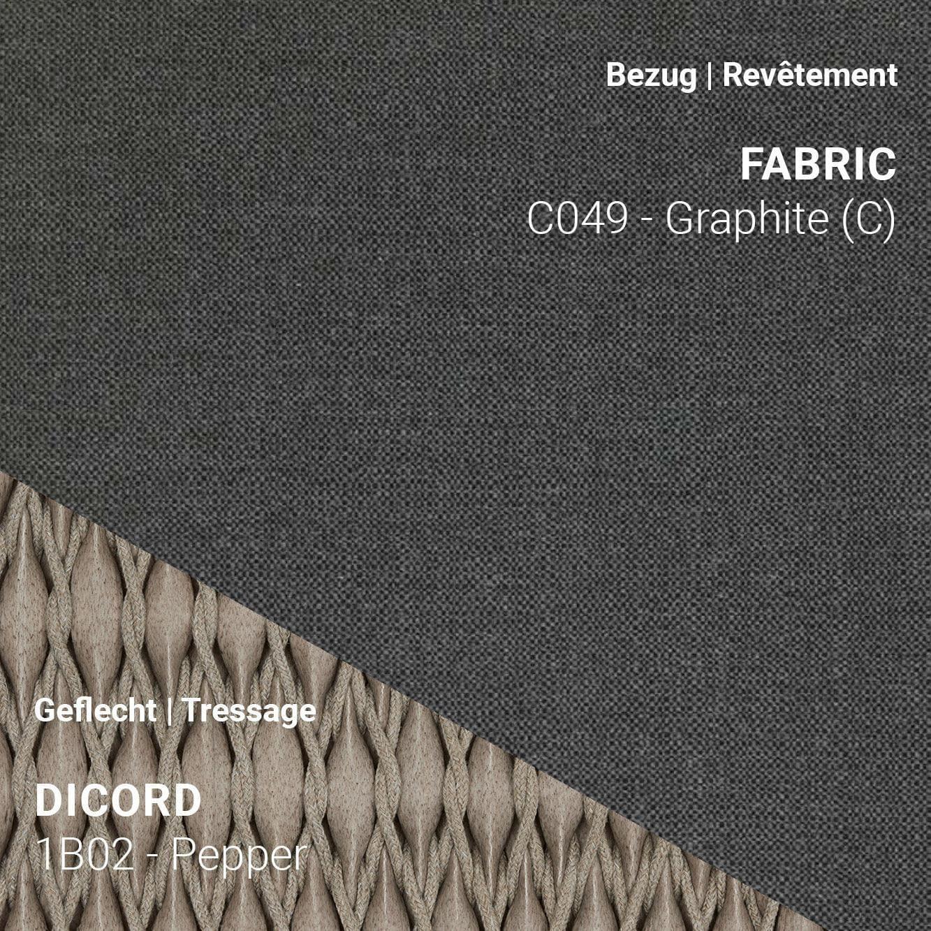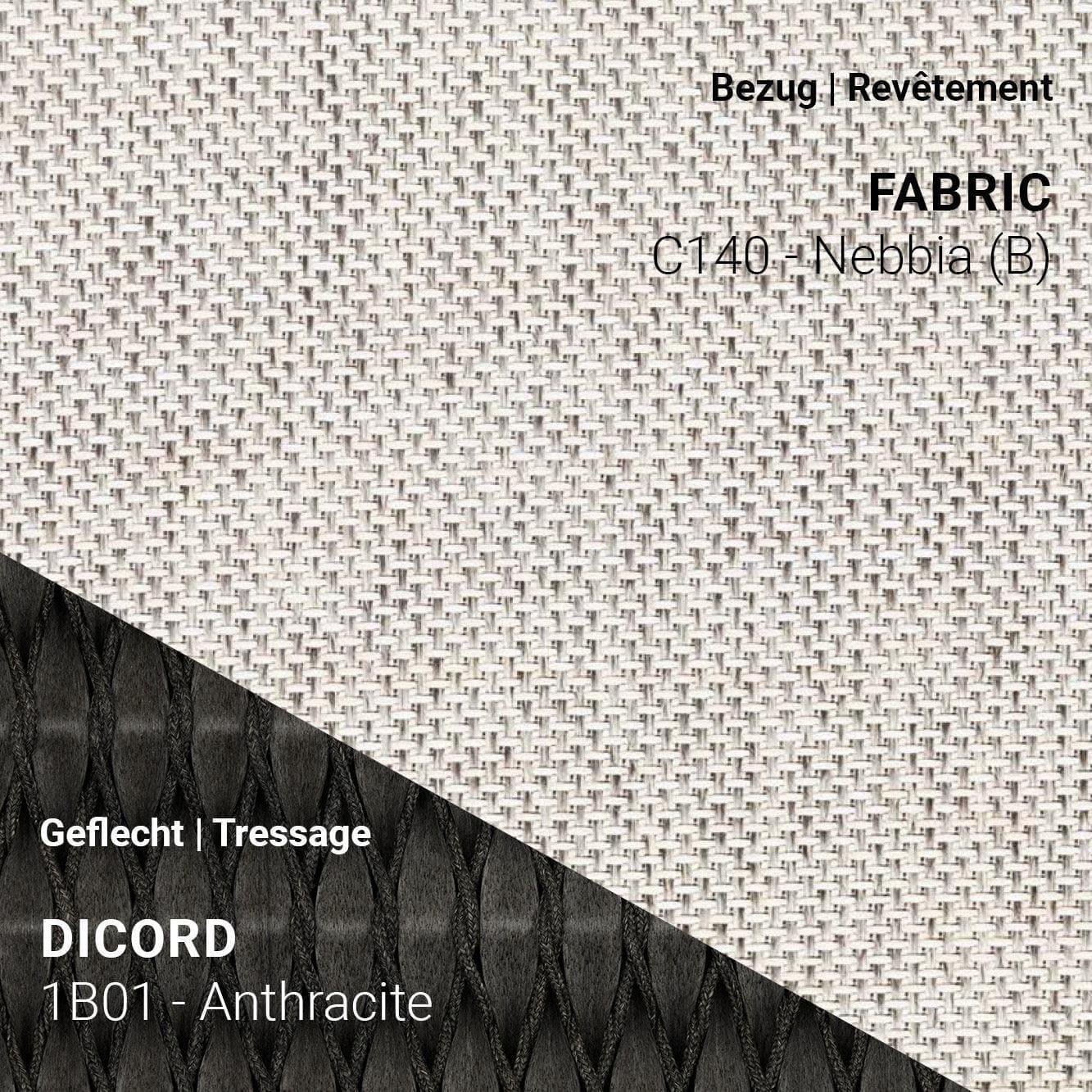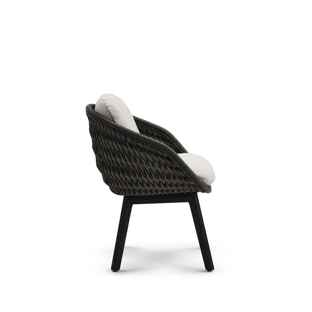 66 x 67 x H81 cm Seat height: 66 cm Armrest height: 43 cm Seat/backrest: Rope braid 4.5mm, recyclable, Green Guard certified Frame: teak Seat/backrest: Anthracite or Pepper Frame: Scuro UV-resistant All furniture in the series is available in 3 color combinations. The Manutti furniture is ordered specifically according to your color preferences and can be combined with 53 different cushion colors. We would be happy to send you samples upon request. However, no exchange is possible for individual orders.