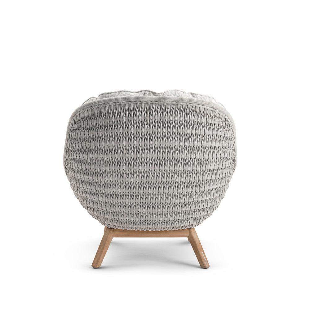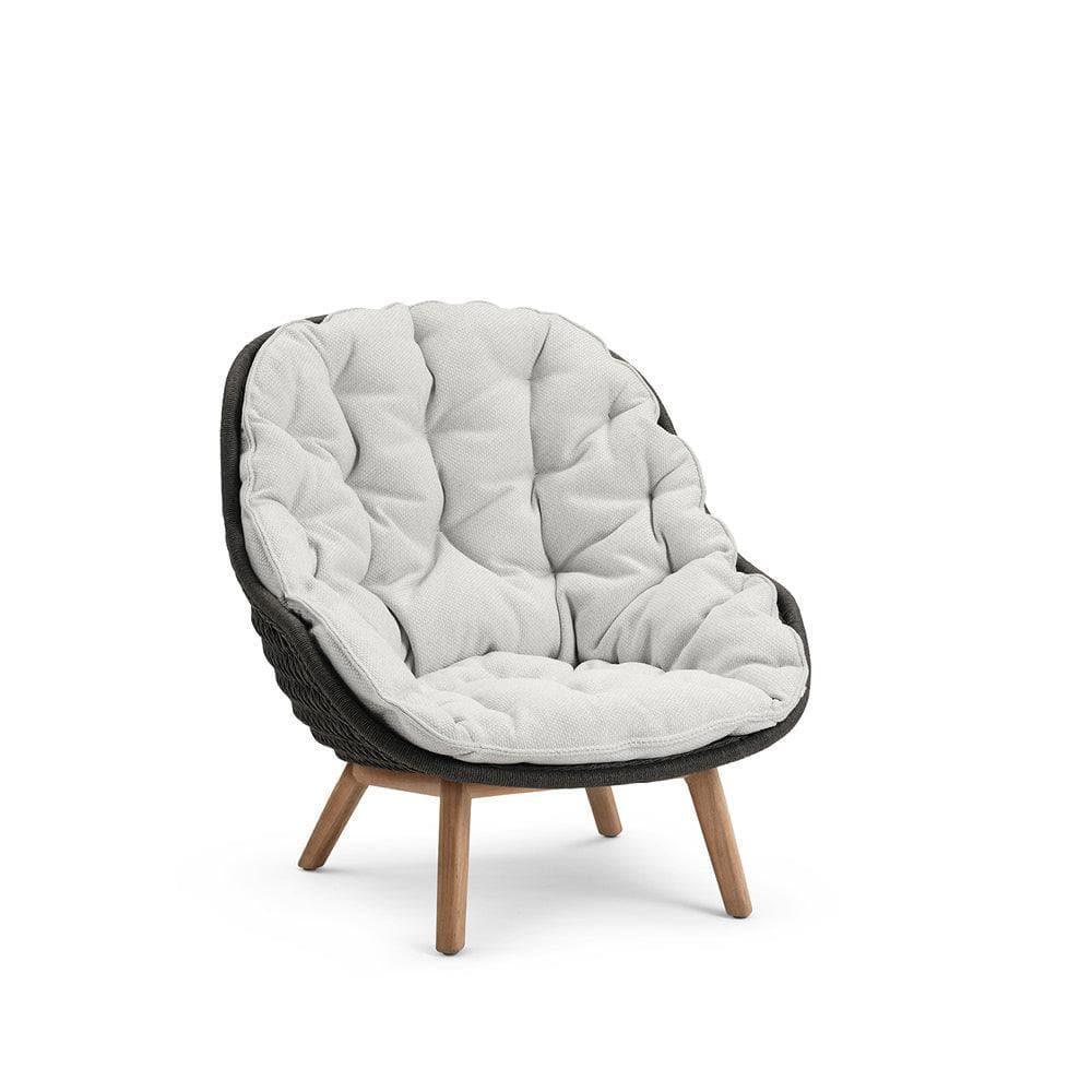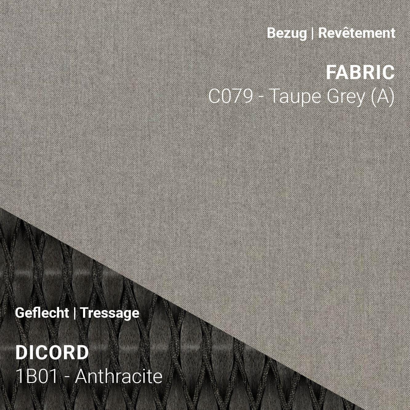 96 x 96 x H94 cm Seat height: 50 cm Armrest height: 32 cm Seat/backrest: Rope braid 4.5mm, recyclable, Green Guard certified Frame: teak Seat/backrest: Anthracite or Pepper Frame: Natural UV-resistant All furniture in the series is available in 3 color combinations. The Manutti furniture is ordered specifically according to your color preferences and can be combined with 53 different cushion colors. We would be happy to send you samples upon request. However, no exchange is possible for individual orders.