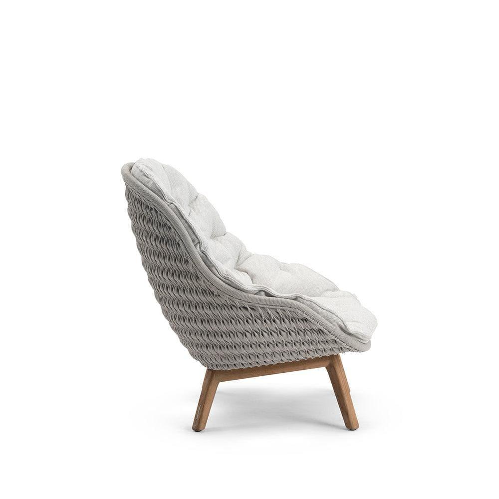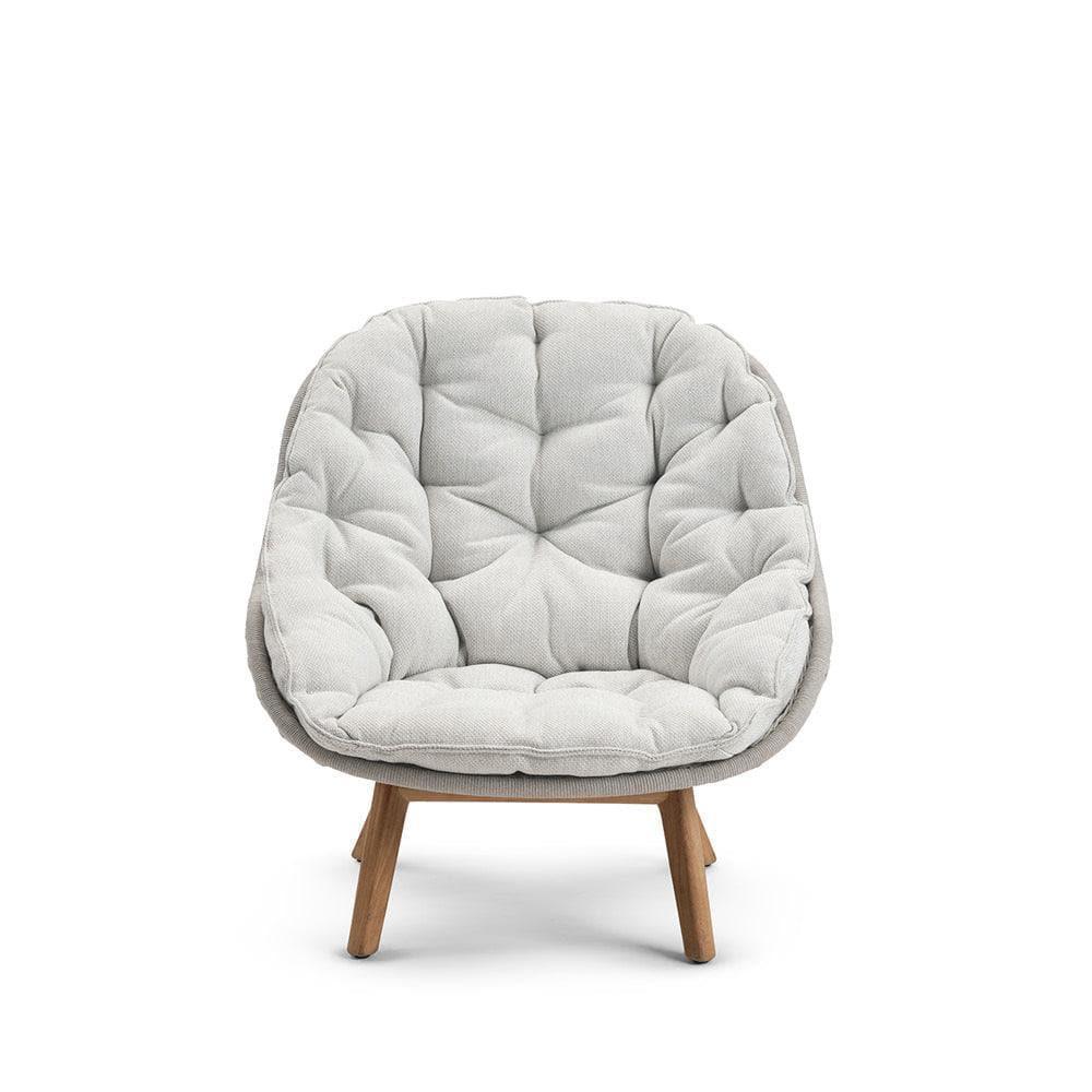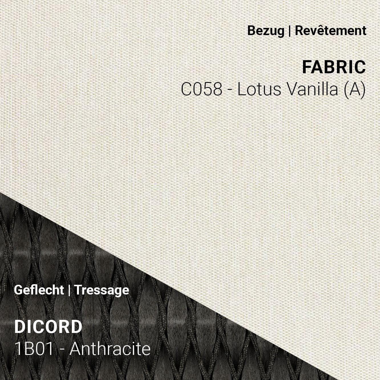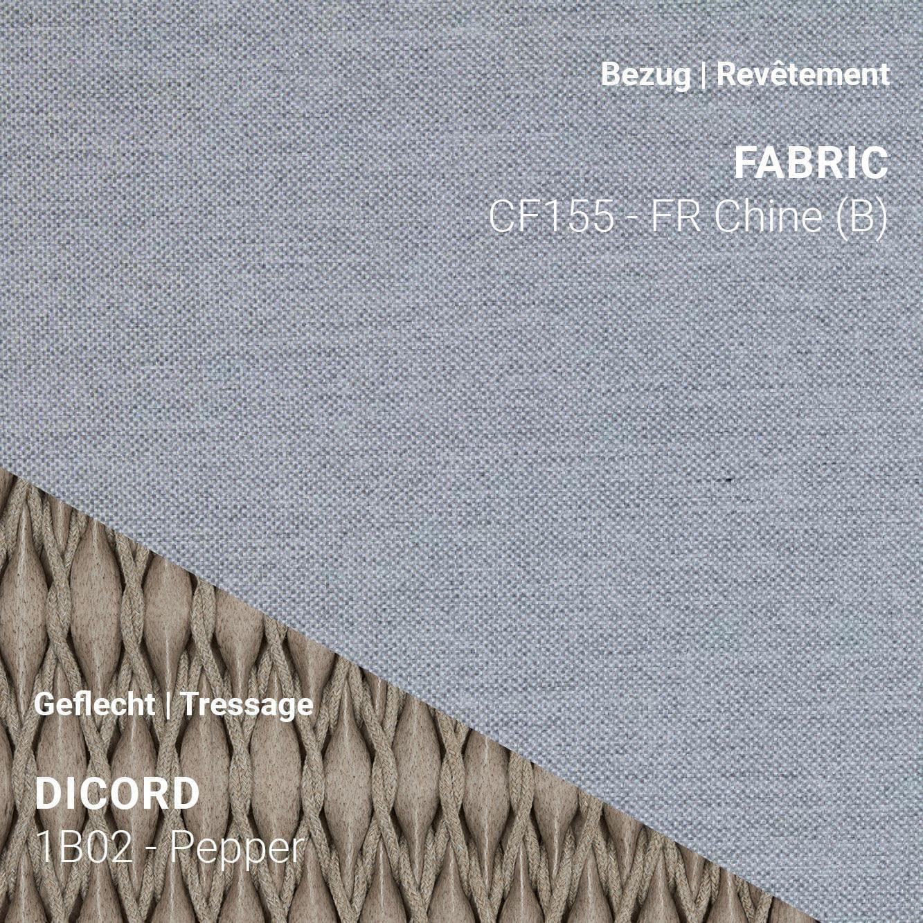 96 x 96 x H94 cm Seat height: 50 cm Armrest height: 32 cm Seat/backrest: Rope braid 4.5mm, recyclable, Green Guard certified Frame: teak Seat/backrest: Anthracite or Pepper Frame: Natural UV-resistant All furniture in the series is available in 3 color combinations. The Manutti furniture is ordered specifically according to your color preferences and can be combined with 53 different cushion colors. We would be happy to send you samples upon request. However, no exchange is possible for individual orders.