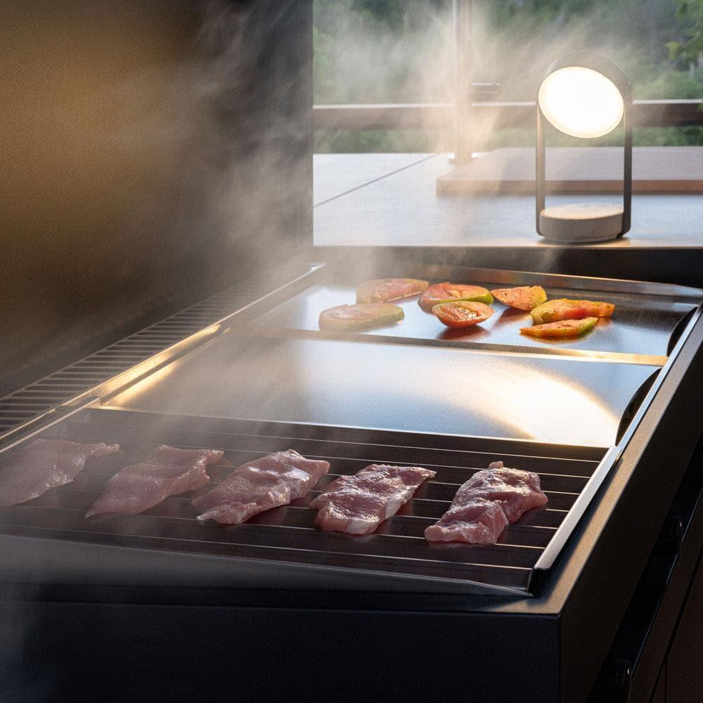 Available modules : barbecue, sink, induction hob, neutral worktop. Available separately on request: hanging snack tray with stoneware surface 240×35 cm, peninsula only together with snack tray, total 360×95 cm, wine fridge, ice cube maker, mini fridge and LED light set. Not just for cooking, but for experiencing the outdoor area in conviviality.