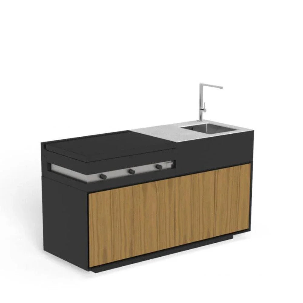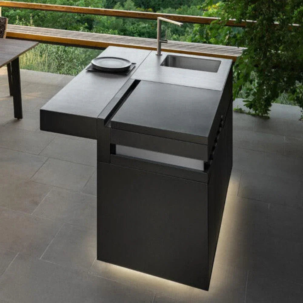 The base structure of the Tikal kitchen with 3 modules is made of a metal alloy, which is protected with a paint specifically suitable for outdoor use and can therefore withstand higher temperatures (Signal black, Ral 9004, textured). Dimensions 240×60, six doors with recessed handles, opening angle 125°, with push-to-open and soft-close function.