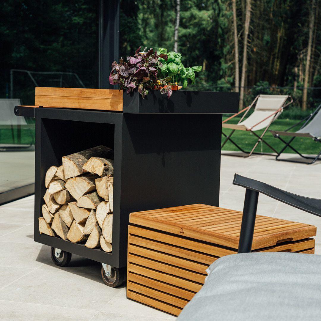 The Ofyr Mise en Place Table PRO is particularly practical thanks to its mobility. Thanks to the robust wheels and elegant teak handle, the table can be moved effortlessly to the desired location. To preserve the beauty of the teak handle, we recommend storing the table under cover when not in use for longer periods. There is a spacious wood storage area under the worktop, which is not only practical but also stylishly integrated.