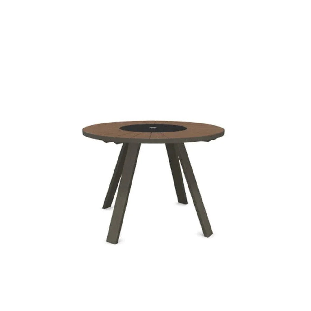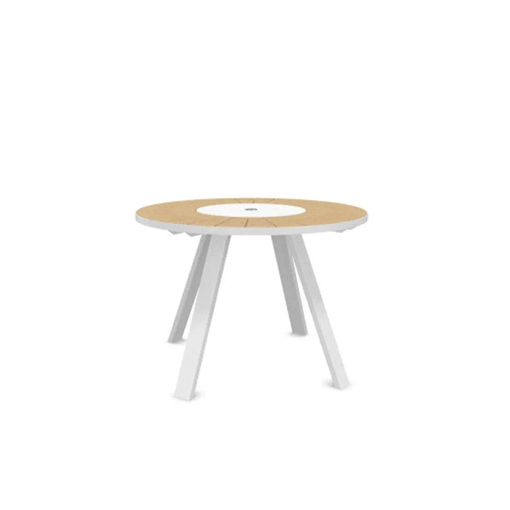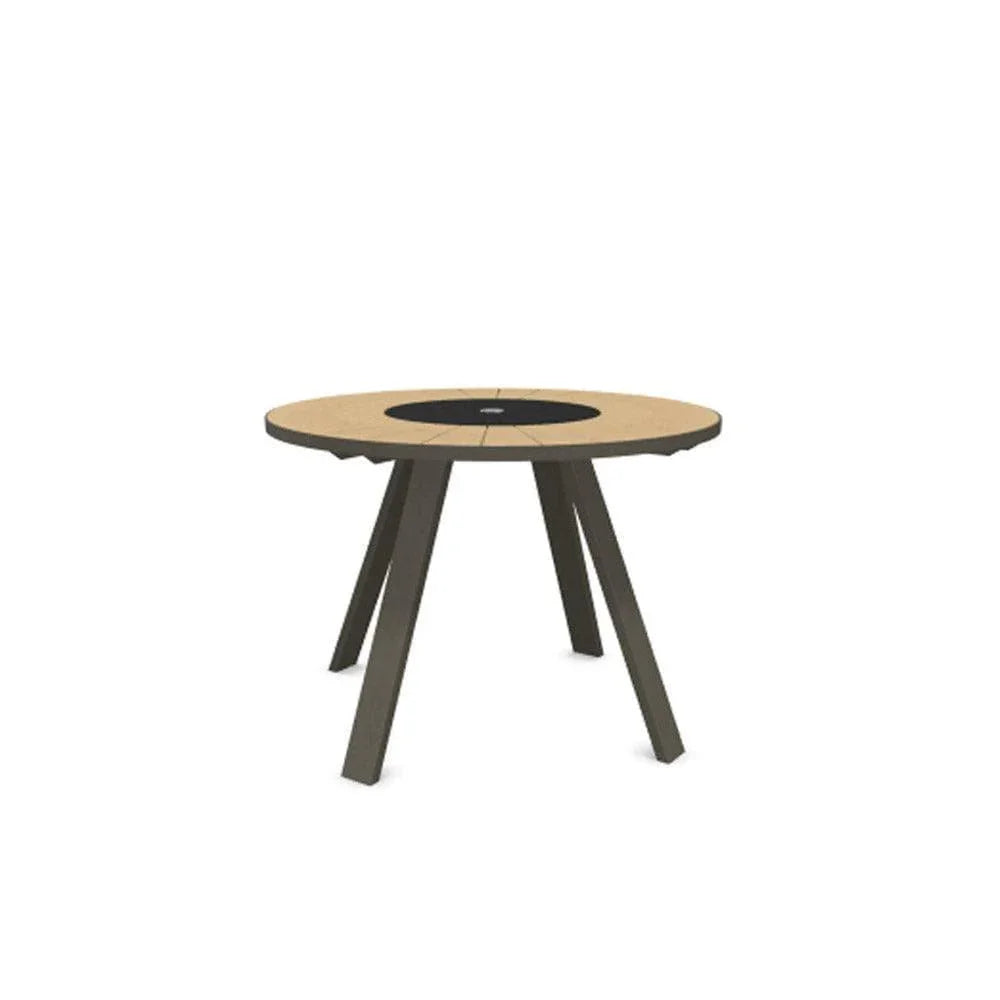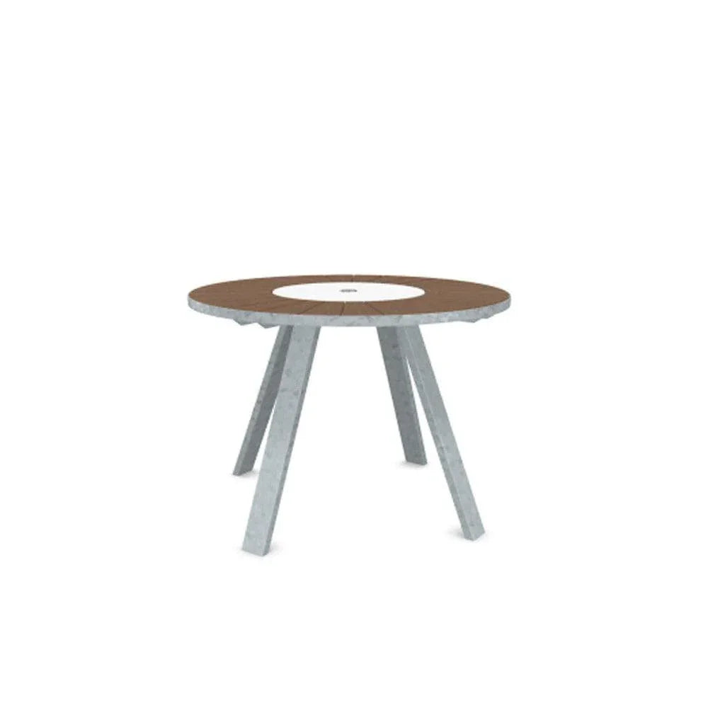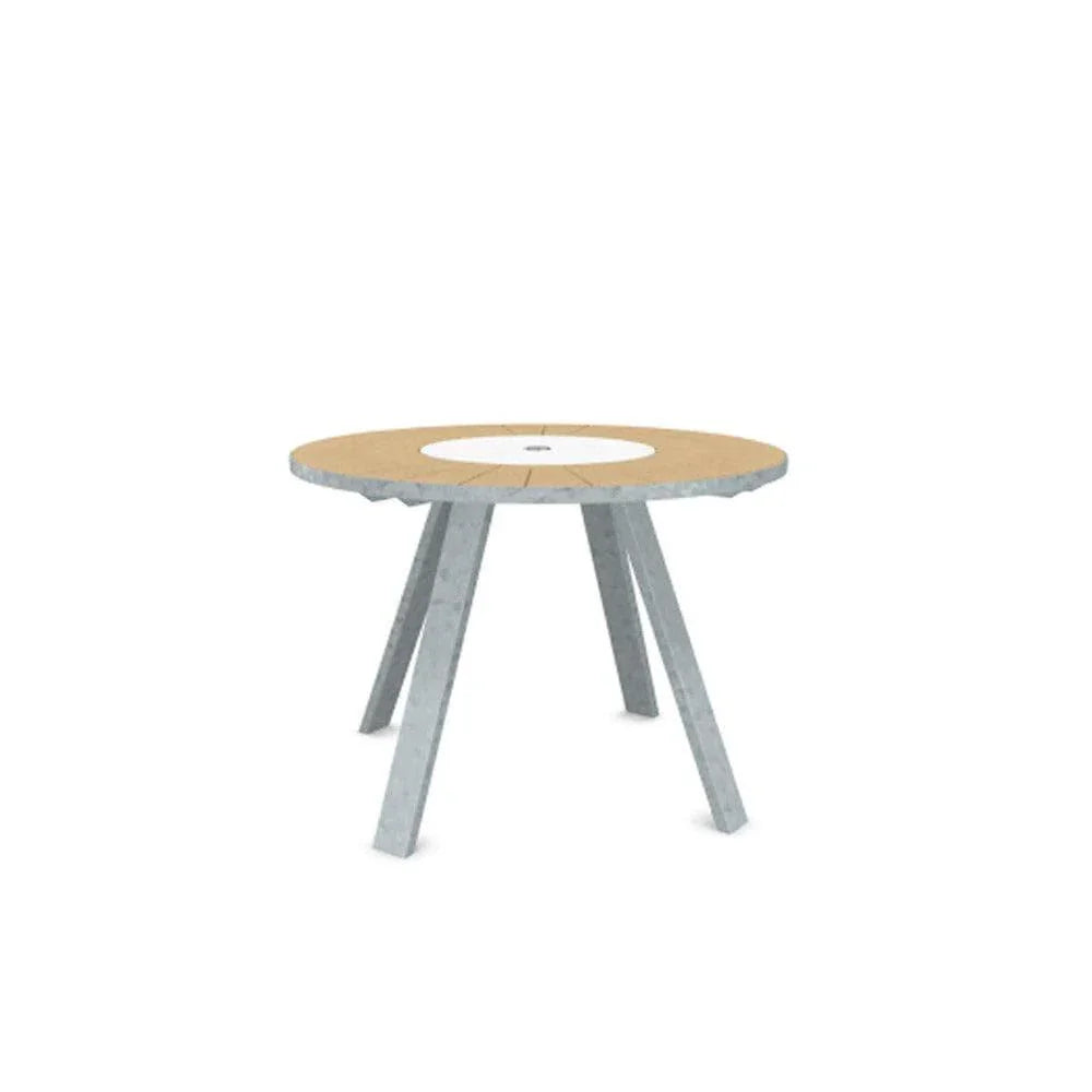 75 cm: Ø146 x H75 cm 105cm: Ø146 x H105cm 75cm: 86kg 105cm: 90kg Table top: Iroko | Hellwood Frame and legs: Hot dip galvanized steel or powder coated galvanized beam