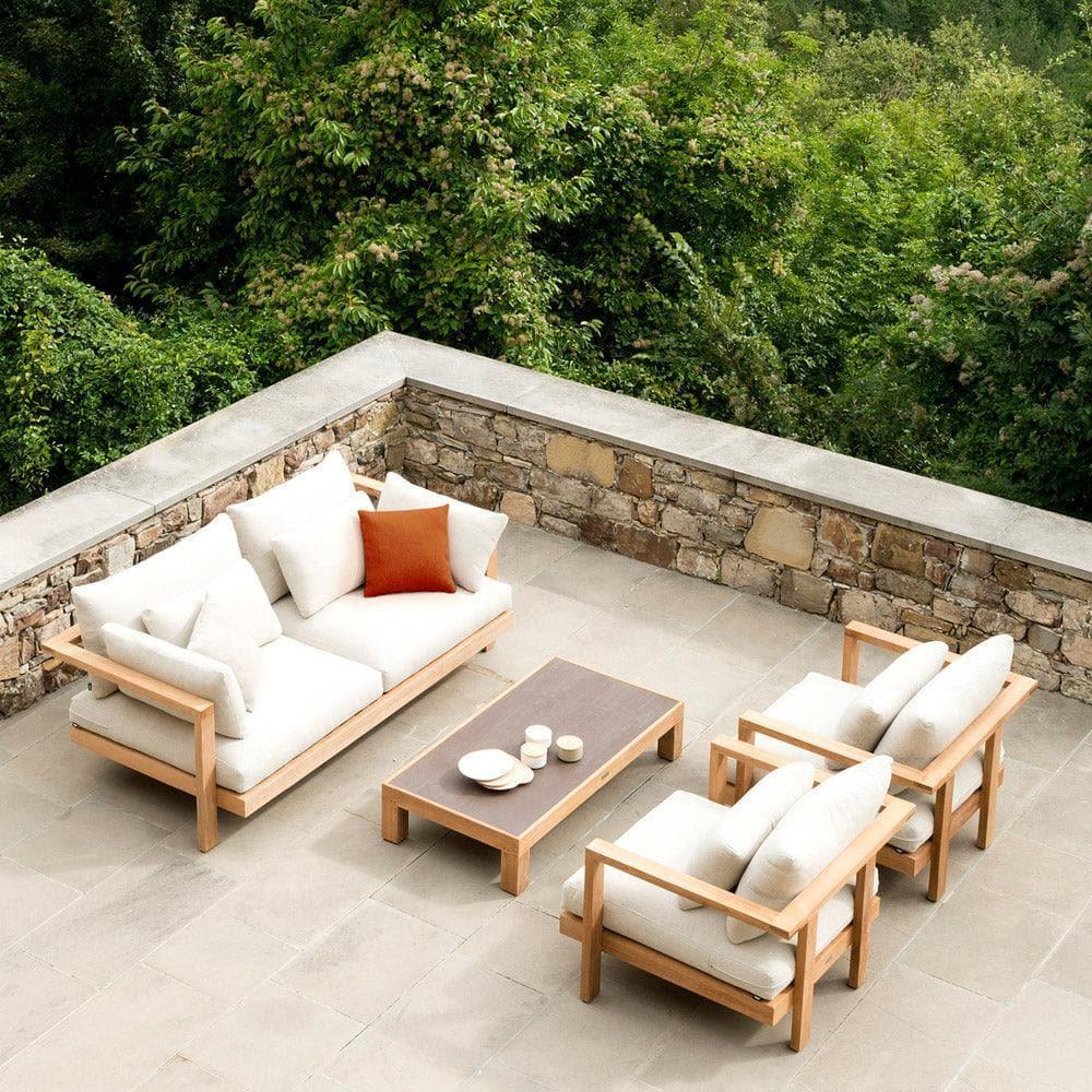 This modular sofa consists of 5 elements from which you can easily create the living room of your dreams. The armchair is available in high-quality teak from Indonesian plantations. Deep sink-in cushions create a casual and relaxing look and are available in a variety of luxurious outdoor fabrics.
