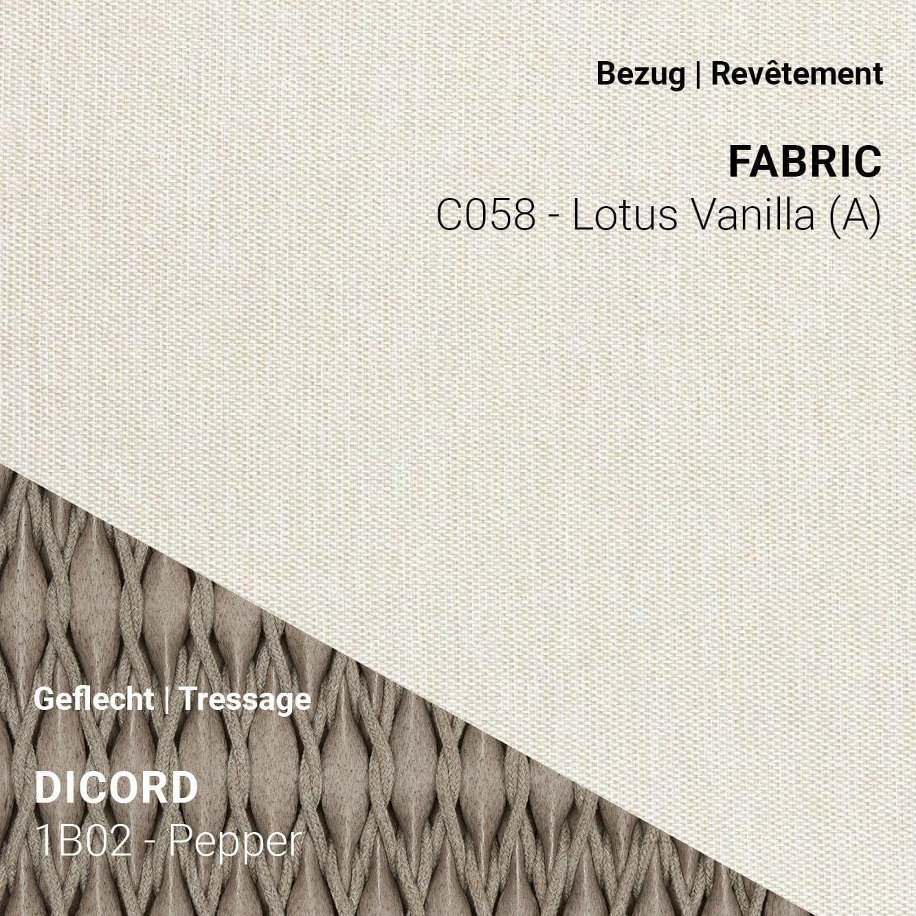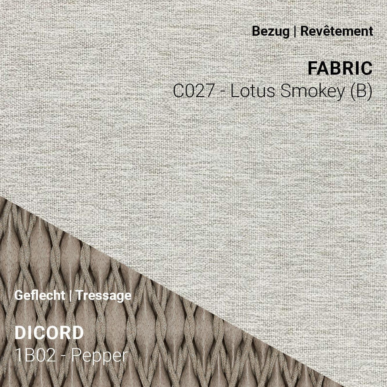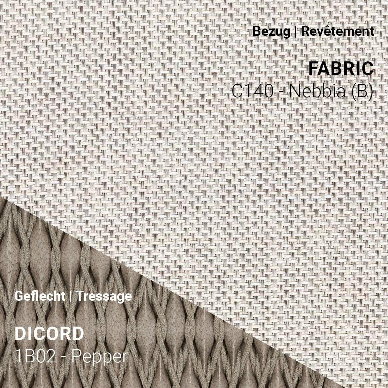105 x 123 x H95 cm Seat height: 41 cm Armrest height: 33 cm Seat/backrest: Rope braid 4.5mm, recyclable, Green Guard certified Frame: teak Seat/backrest: Anthracite or Pepper Frame: Natural UV-resistant All furniture in the series is available in 3 color combinations. The Manutti furniture is ordered specifically according to your color preferences and can be combined with 53 different cushion colors. We would be happy to send you samples upon request. However, no exchange is possible for individual orders.