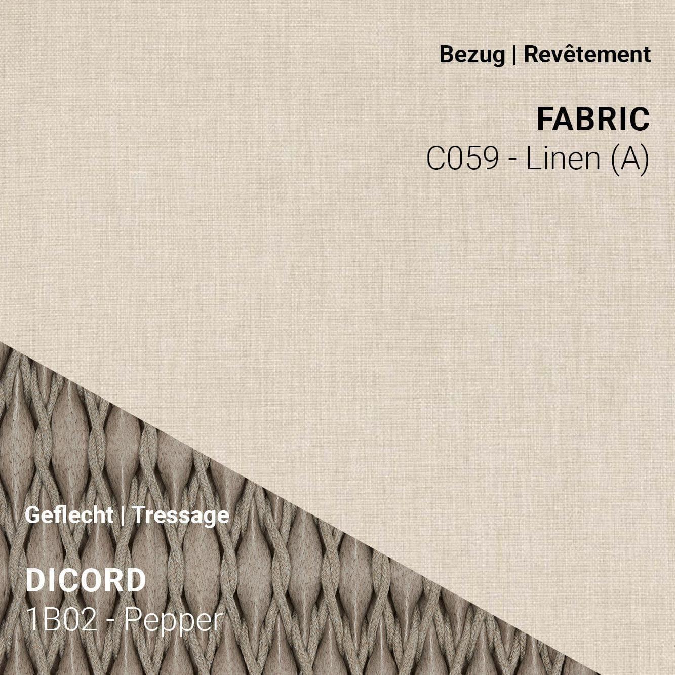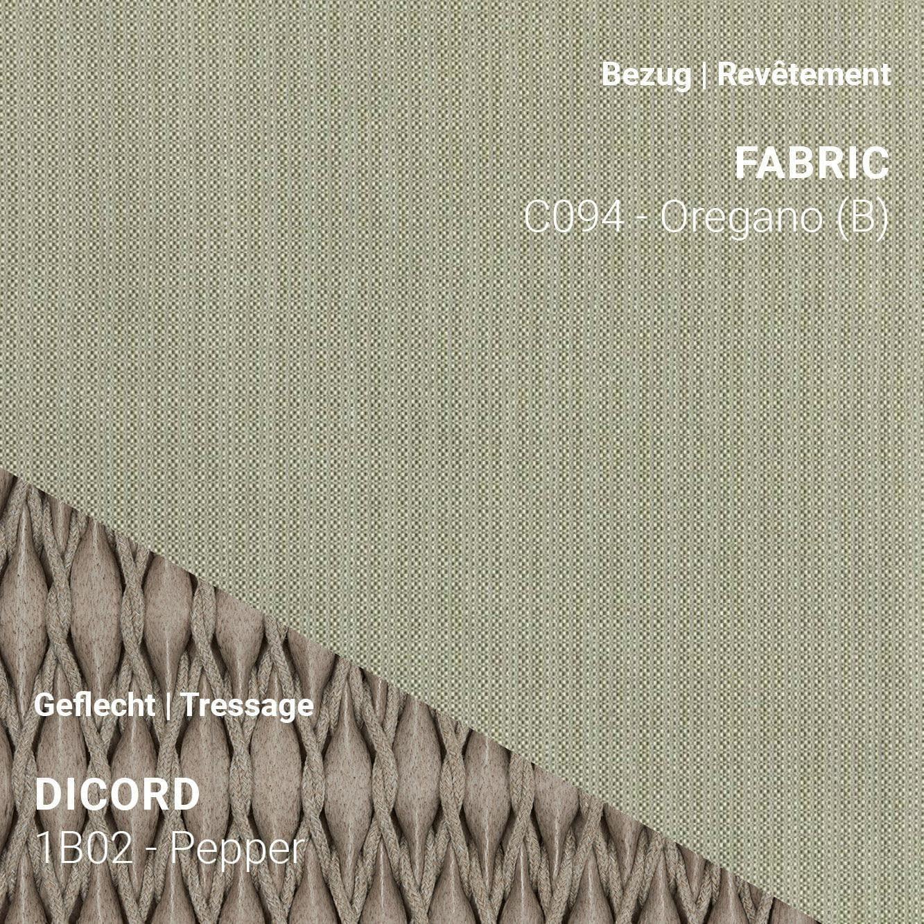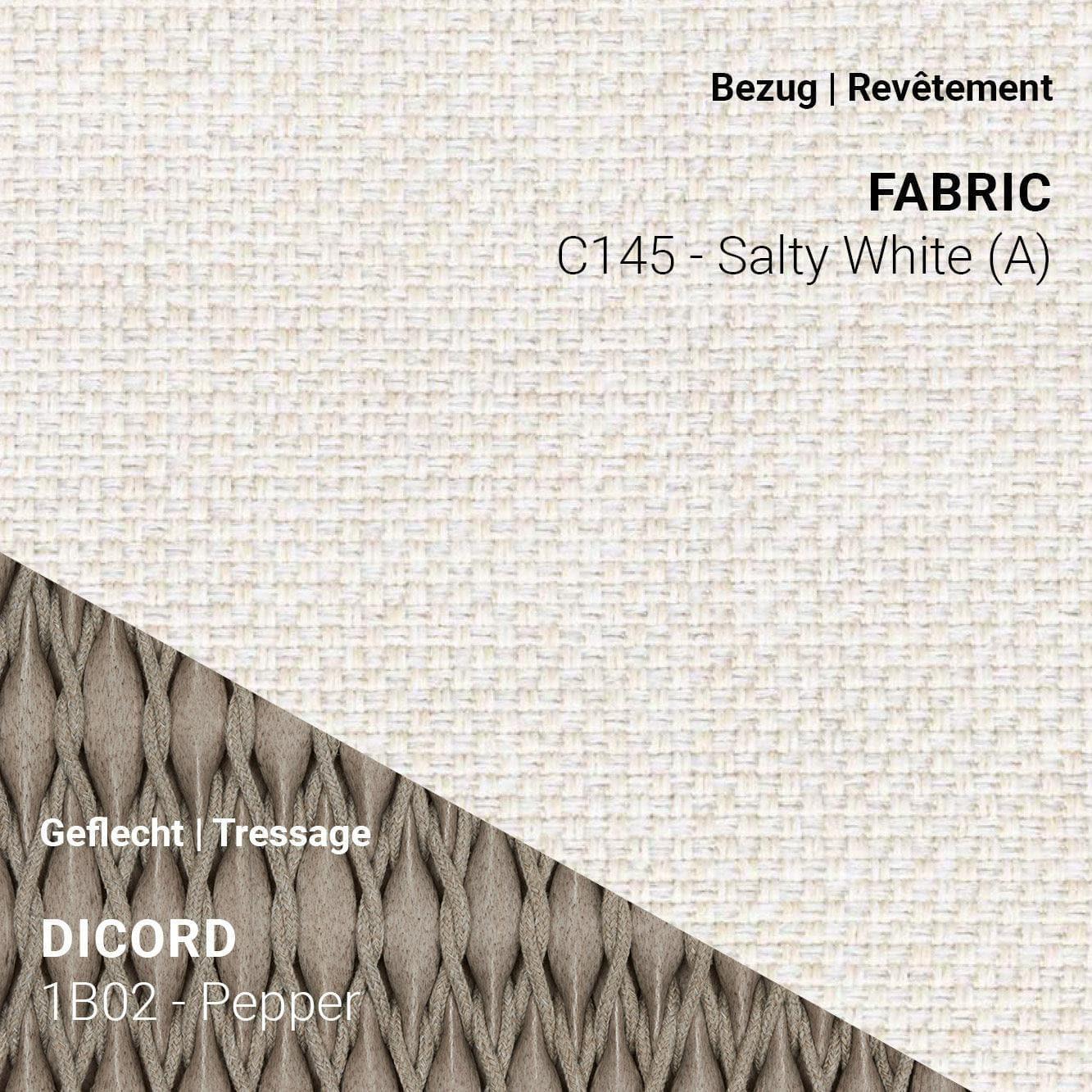 105 x 123 x H95 cm Seat height: 41 cm Armrest height: 33 cm Seat/backrest: Rope braid 4.5mm, recyclable, Green Guard certified Frame: teak Seat/backrest: Anthracite or Pepper Frame: Scuro UV-resistant All furniture in the series is available in 3 color combinations. The Manutti furniture is ordered specifically according to your color preferences and can be combined with 53 different cushion colors. We would be happy to send you samples upon request. However, no exchange is possible for individual orders.