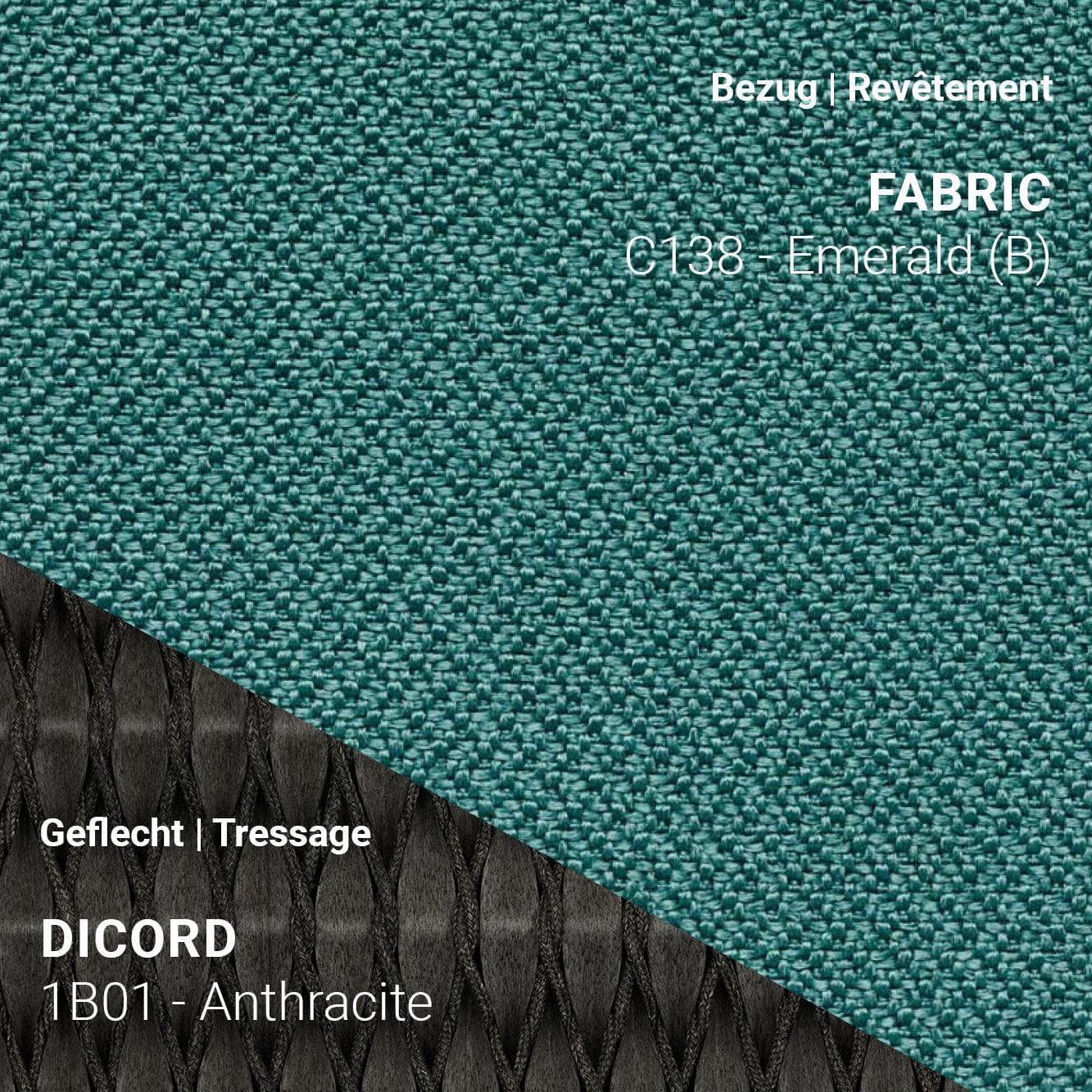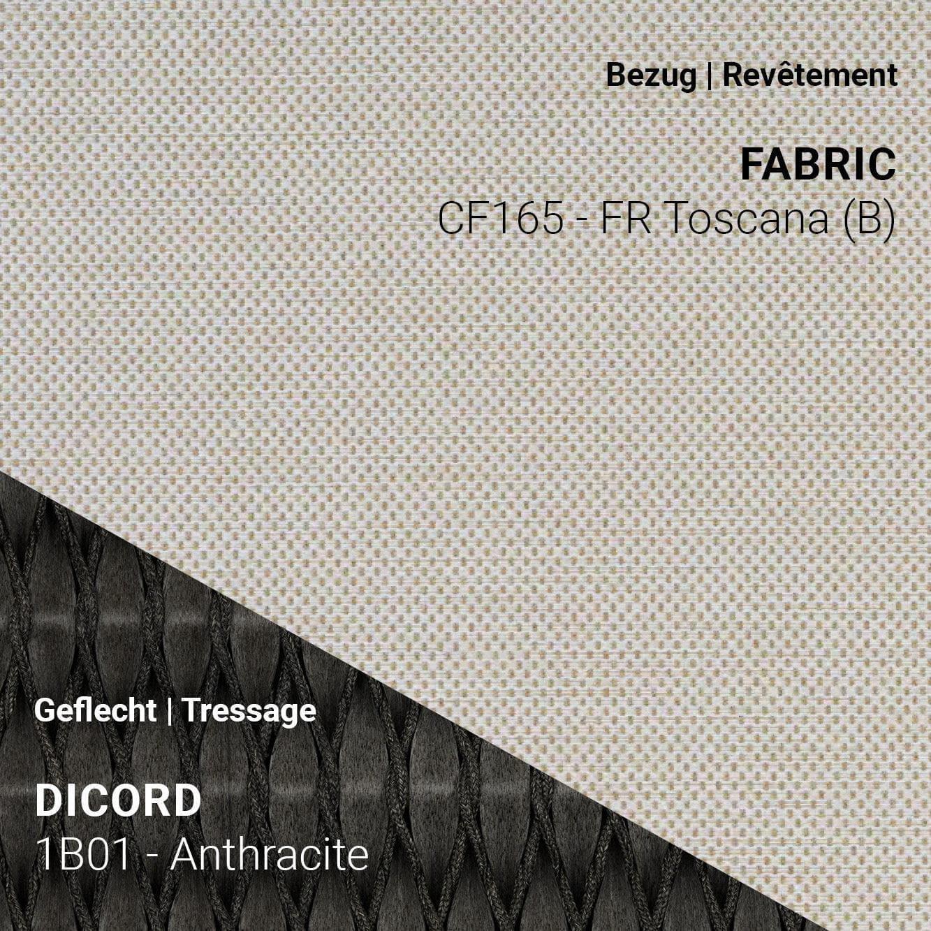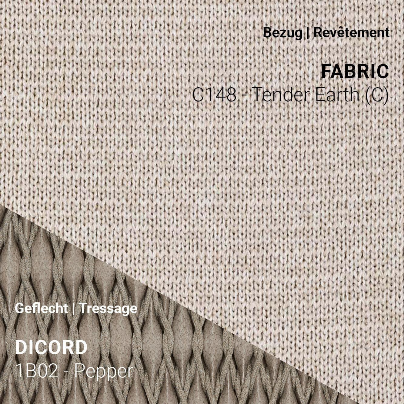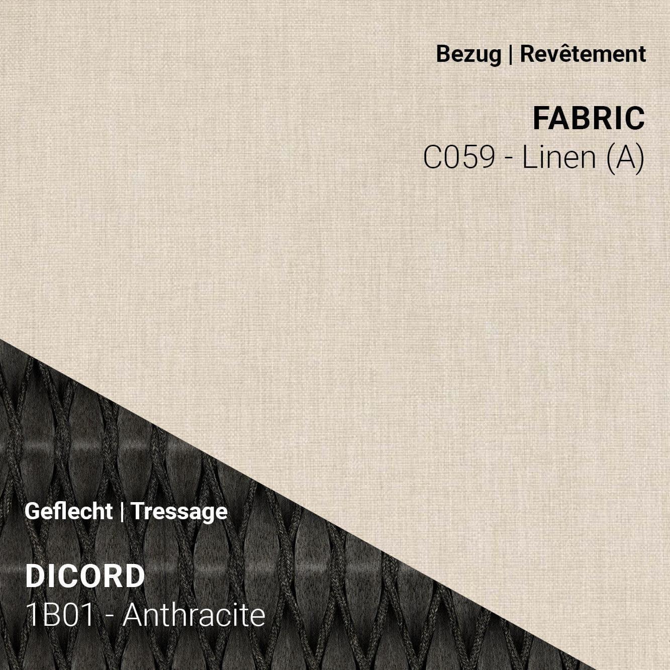105 x 123 x H95 cm Seat height: 41 cm Armrest height: 33 cm Seat/backrest: Rope braid 4.5mm, recyclable, Green Guard certified Frame: teak Seat/backrest: Anthracite or Pepper Frame: Scuro UV-resistant All furniture in the series is available in 3 color combinations. The Manutti furniture is ordered specifically according to your color preferences and can be combined with 53 different cushion colors. We would be happy to send you samples upon request. However, no exchange is possible for individual orders.