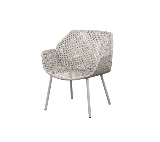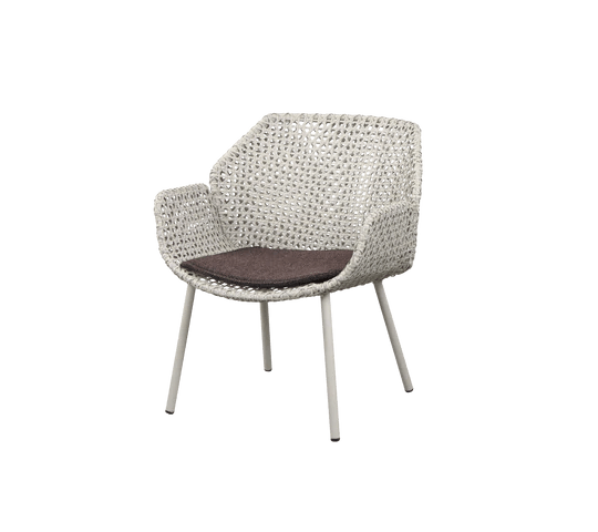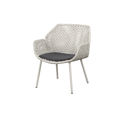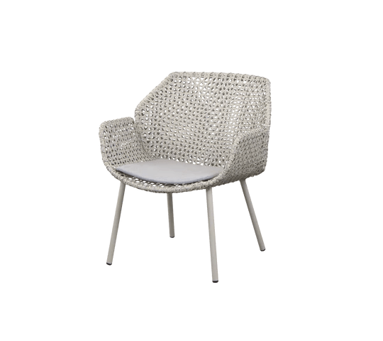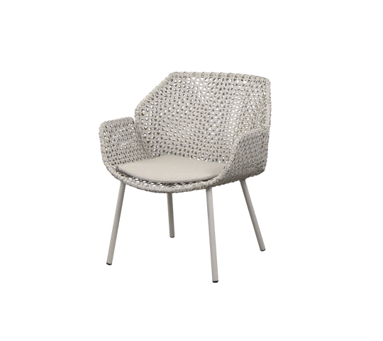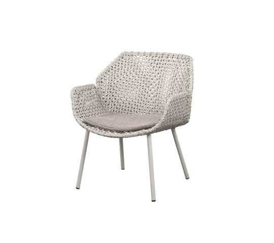 Nahaufnahme eines Cane-line-Sessels mit hellen Polstern.