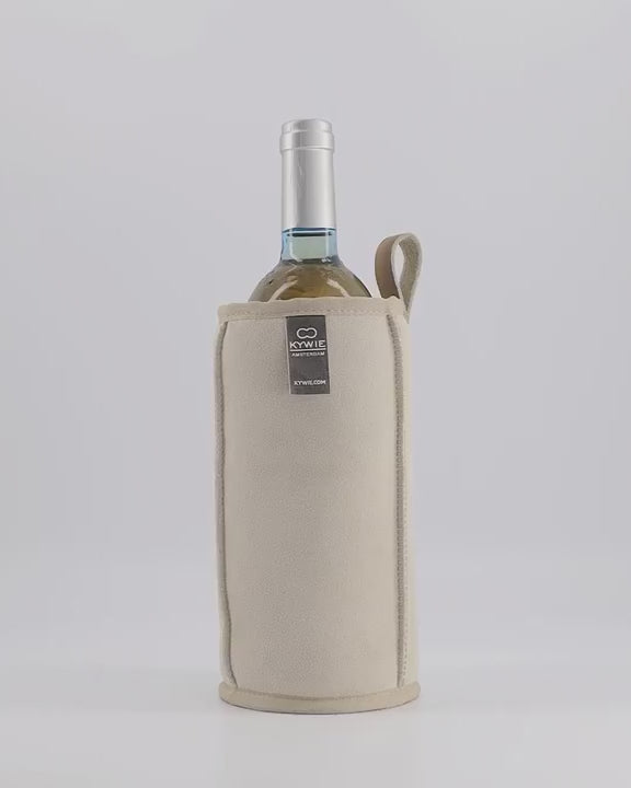 Discover the luxurious KYWIE wine cooler in the sophisticated Beige Suede color, an essential accessory for any wine lover with style. This wine cooler is not only a functional product, but also an expression of elegance and sustainability. Made from 100% natural Texel sheepskin, it combines precision craftsmanship with innovative design. The leather, which comes from the famous sheep of the Dutch island of Texel, provides a robust yet soft surface feel that will enhance any table or picnic area.