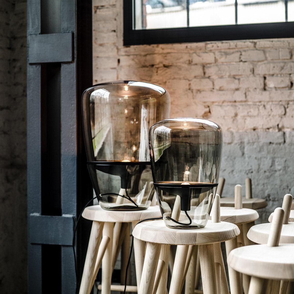 Brokis-Leuchten mit Holzsockeln, vor großen Fenstern.