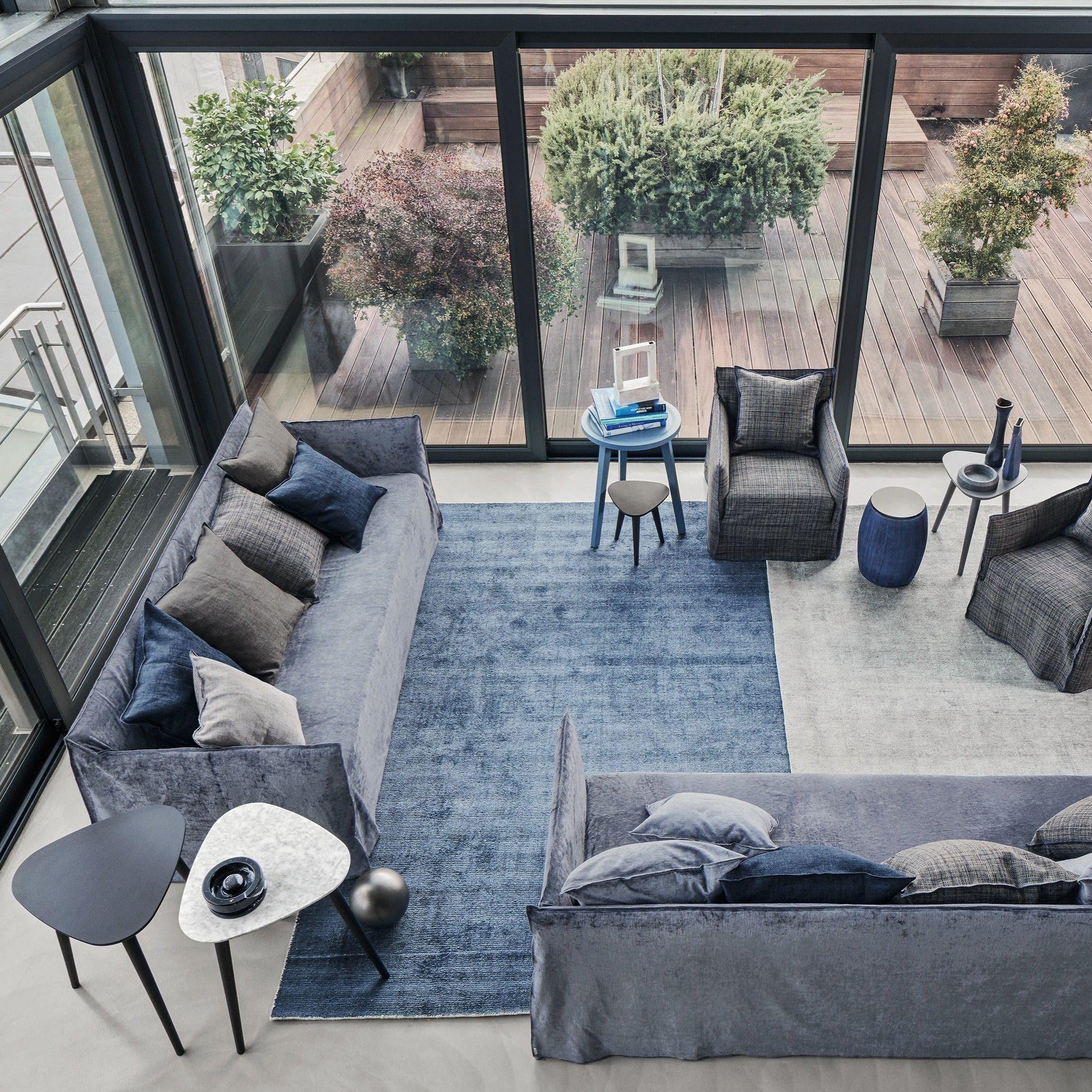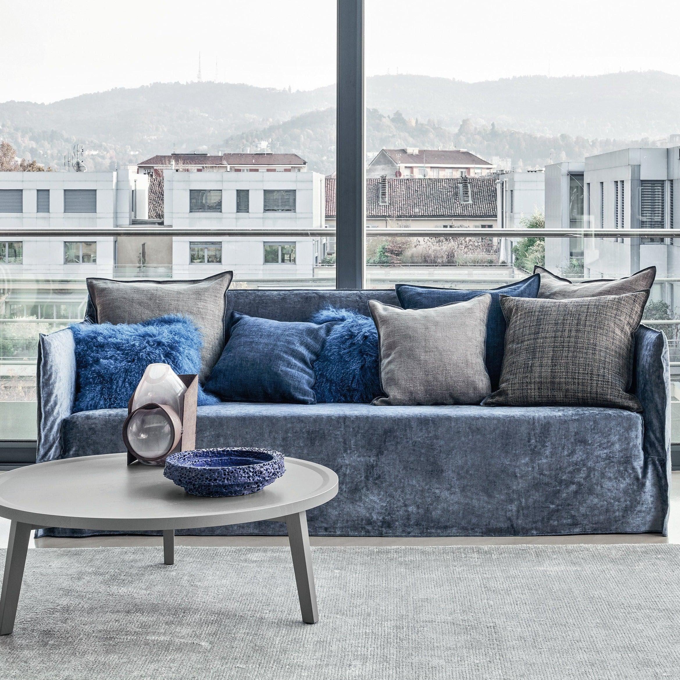 Ghost, un canapé qui se développe autour d'une coque légère aux volumes essentiels. Ghost est constitué d'une structure minimale et fine, rembourrée de mousse de polyuréthane, et contient des coussins moelleux en duvet mixte. La caractéristique principale des canapés Ghost est la housse amovible, un boîtier surdimensionné dont le profil est souligné par les coutures apparentes, ce qui permet d'enlever et de remettre les produits en un clin d'œil. C'est un projet textile qui change facilement de visage et vous permet de passer facilement et rapidement d'un look formel à un look informel.