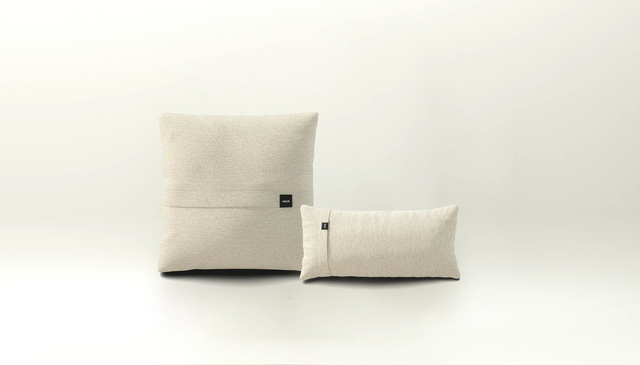 Beiges Vetsak Sofa mit Kissen neben weißem Beistelltisch.