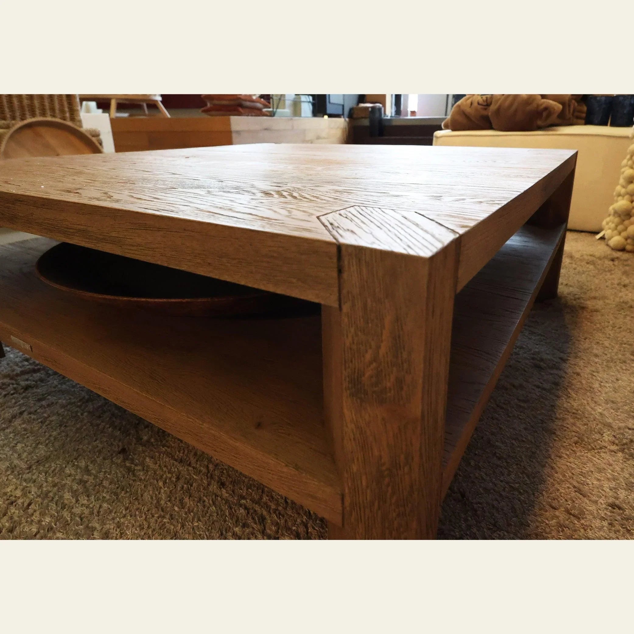 Pièce d'exposition: Oui Masse: Table basse: 100 x 100 xh38cm / salon: 4062 x 215 x H70cm / Boîte de rangement: 90 x 40 x H45cm Matériel: Table basse: recyclé chêne/ Lounge: Spark White: Copperfield Weave / Blee Blue French Weven / Polyester, bois de hêtre / Boîte de rangement: Rattan Lassio, Jagany Wood