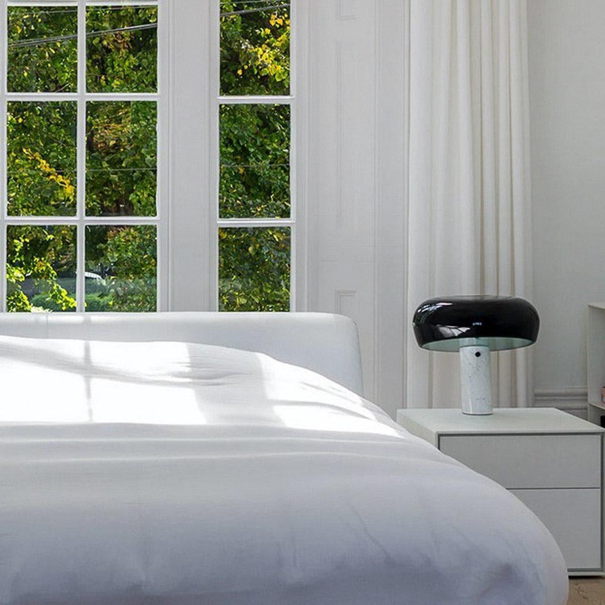 L'étonnant abat-jour en verre rappelle la tête du fidèle chien beagle. Comme la tête de Snoopy, elle repose sur un corps plus léger et plus petit. L'interrupteur avec gradateur tactile intégré est situé à l'endroit où Snoopy a son collier, tandis que le câble de la lampe forme la queue qui s'agite.