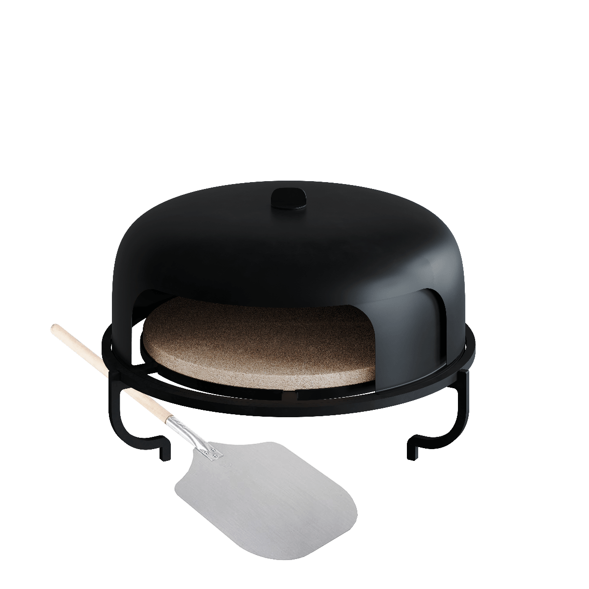 S'il y a un appareil de cuisson en plein air qui est super populaire de nos jours, c'est bien le fameux four à pizza ! Avec son feu de bois qui crépite, votre OFYR se prête particulièrement bien à la préparation de délicieuses pizzas. Il n'a donc pas fallu grand-chose pour inspirer ce petit four amovible qui vous permet de passer en un clin d'œil des brochettes de viande aux "4 saisons" faites maison ! Le four à pizza OFYR se compose d'une plaque en fonte lisse qui accueille les pizzas d'un côté et est nervurée de l'autre pour servir de grill, d'une pierre à pizza à poser et d'une double cloche en acier pour une cuisson uniforme. Un bouton rotatif sur la plaque de cuisson vous permet de régler facilement la taille de l'ouverture entre la cloche intérieure et la cloche extérieure et de contrôler ainsi la circulation de l'air et donc la température de cuisson. Utilisez toujours des gants de four lorsque vous manipulez le bouton rotatif, car il peut devenir extrêmement chaud.