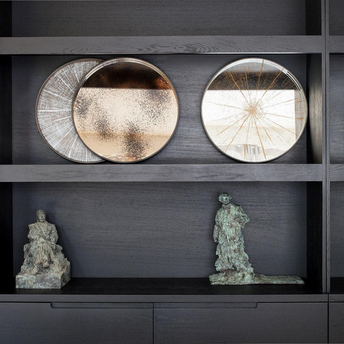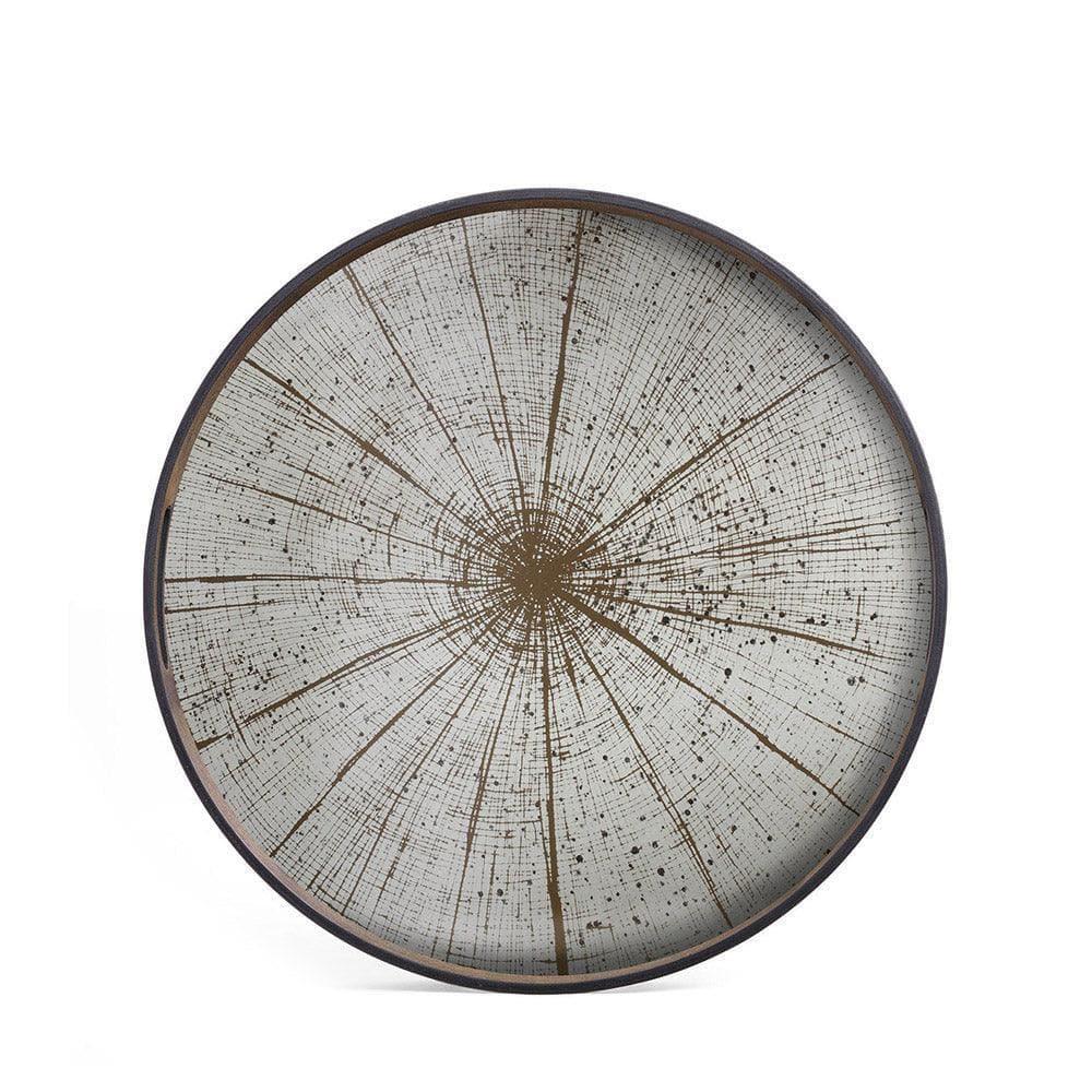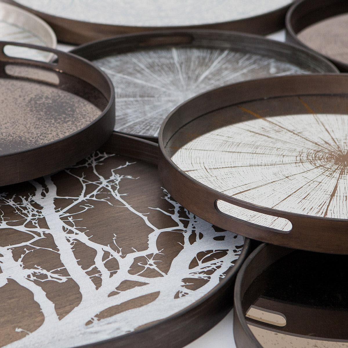 Le plateau est fabriqué à partir d'un verre miroir de haute qualité, dont le processus de vieillissement accéléré lui confère un aspect authentique et luxueux. Cela atténue le reflet du verre et fait ressortir le motif appliqué de manière raffinée, ce qui en fait à la fois un élément décoratif et un objet d'usage fonctionnel.