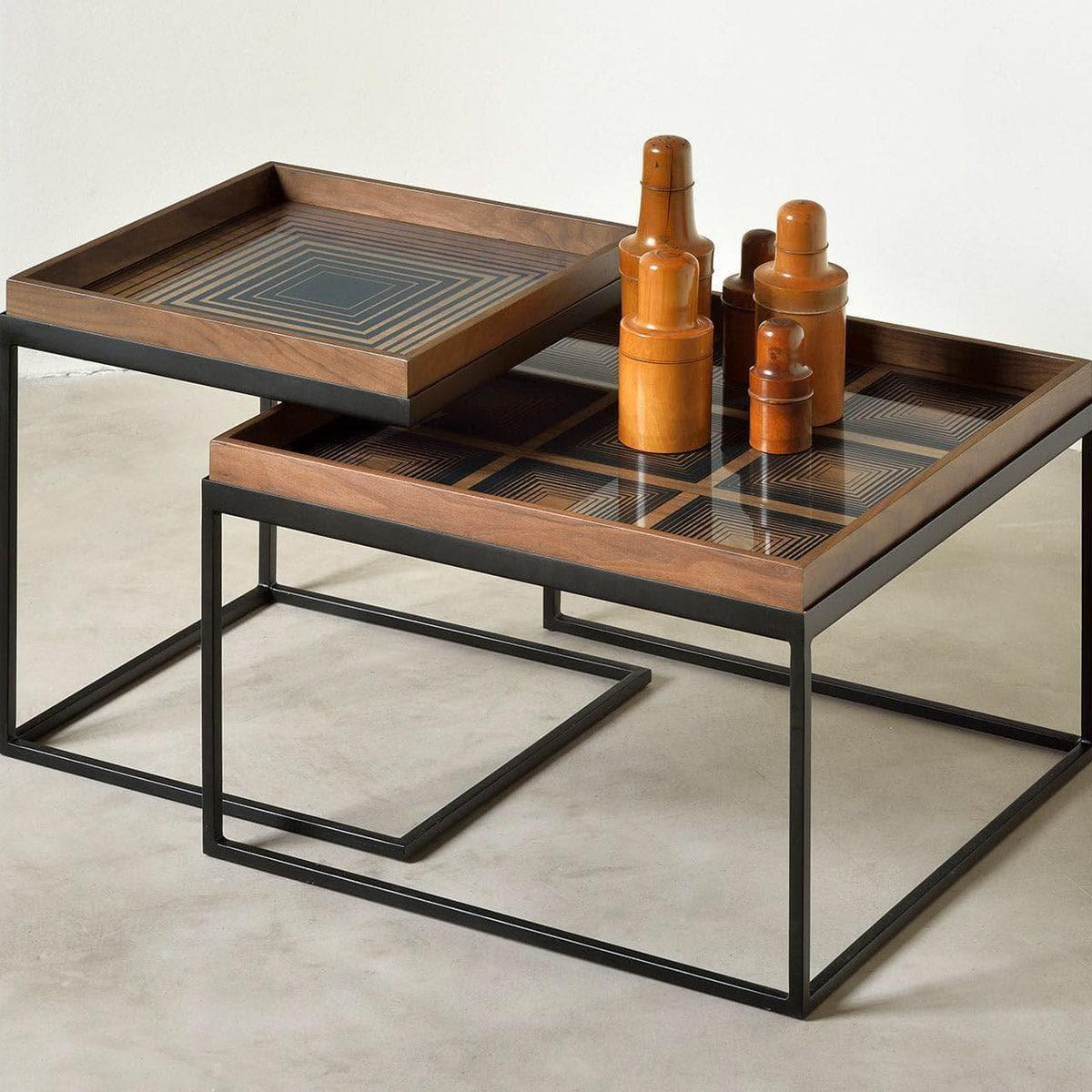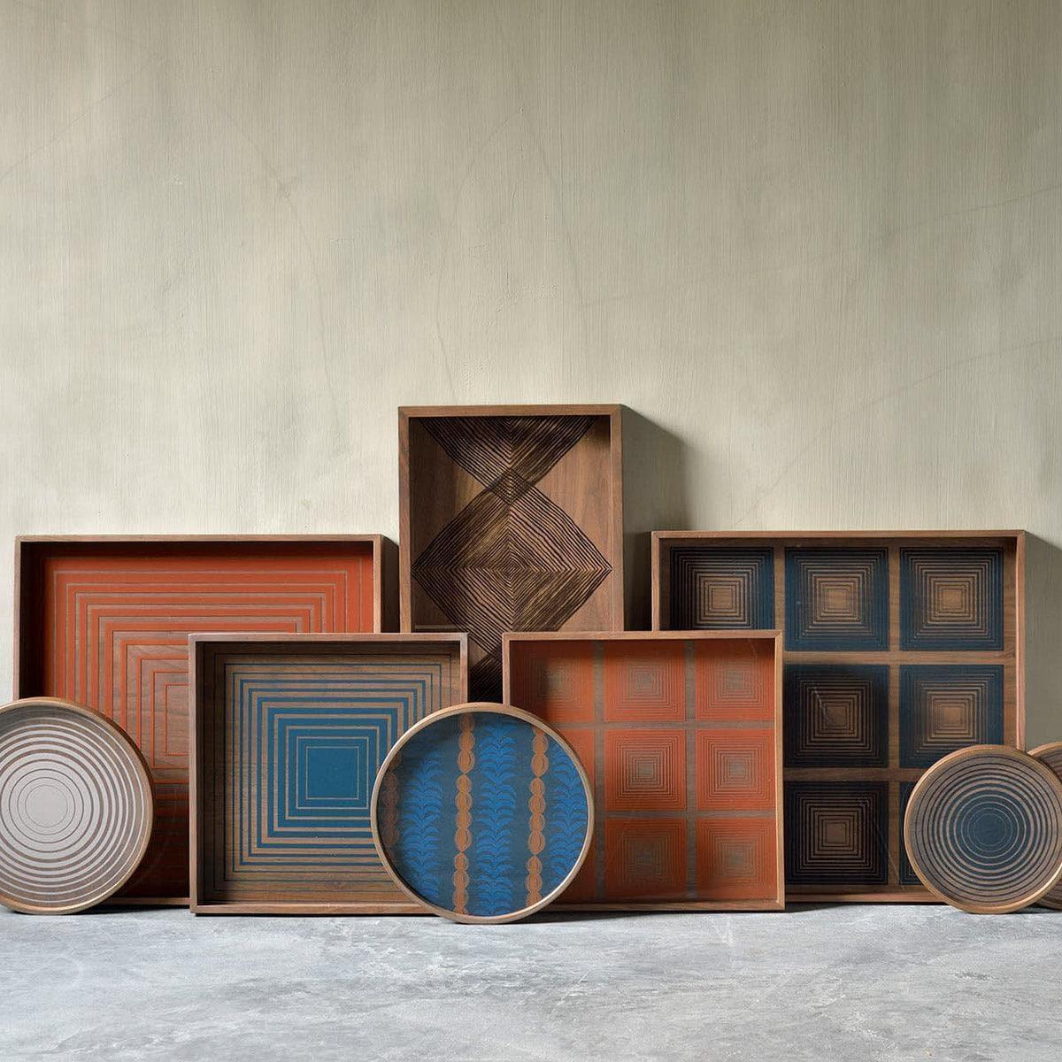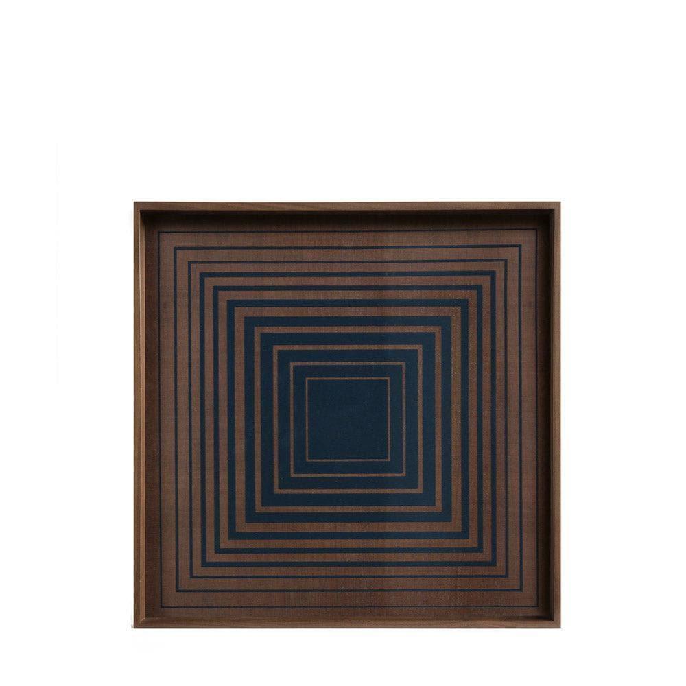 L'association innovante du bois de noyer foncé et d'un plateau en verre transparent avec une sérigraphie complexe de couleur royale fait du plateau en verre INK un véritable accroche-regard. La sérigraphie confère aux impressions sur le verre une profondeur et une intensité remarquables, tandis que le bois et la texture fine du plateau transparaissent à travers l'impression et confèrent une dimension supplémentaire au design. Cette subtile transparence crée un fascinant jeu d'ombre et de lumière qui souligne le caractère noble du plateau.