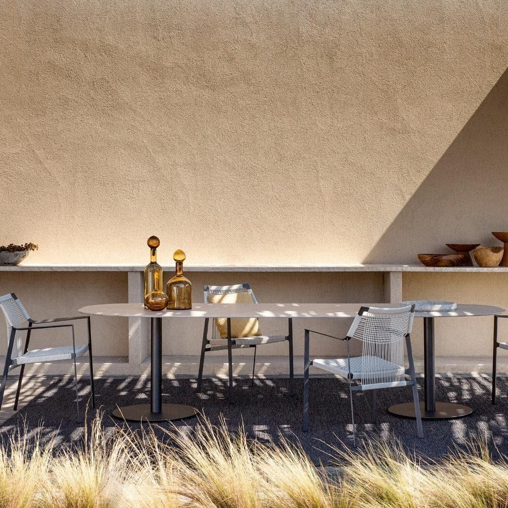 La table ovale T-Table est conçue pour rendre les repas informels en extérieur aussi invitants et détendus que possible. Les coins légèrement arrondis de la table permettent toujours d'accueillir un invité supplémentaire et les pieds placés au centre offrent à chacun un espace confortable pour les jambes.