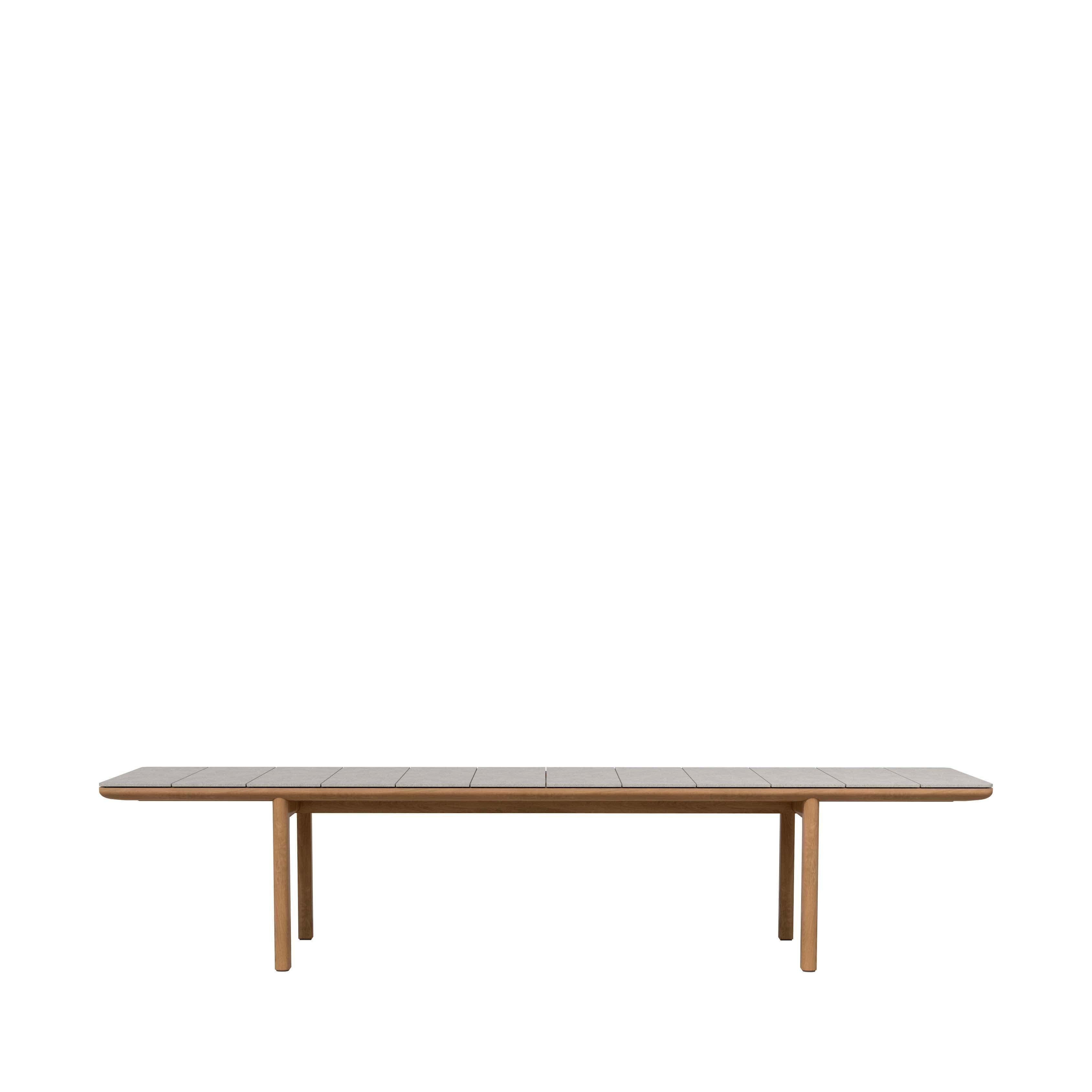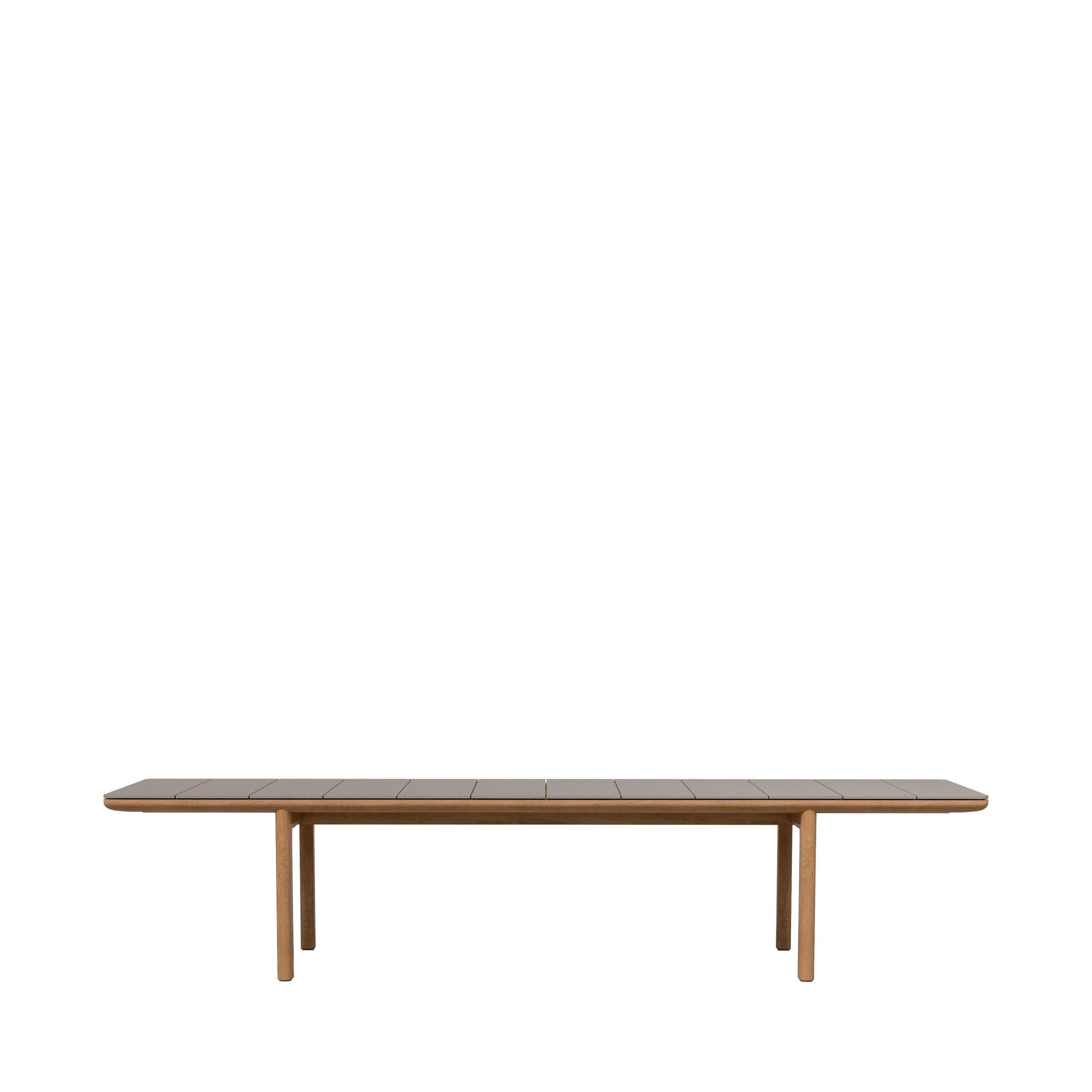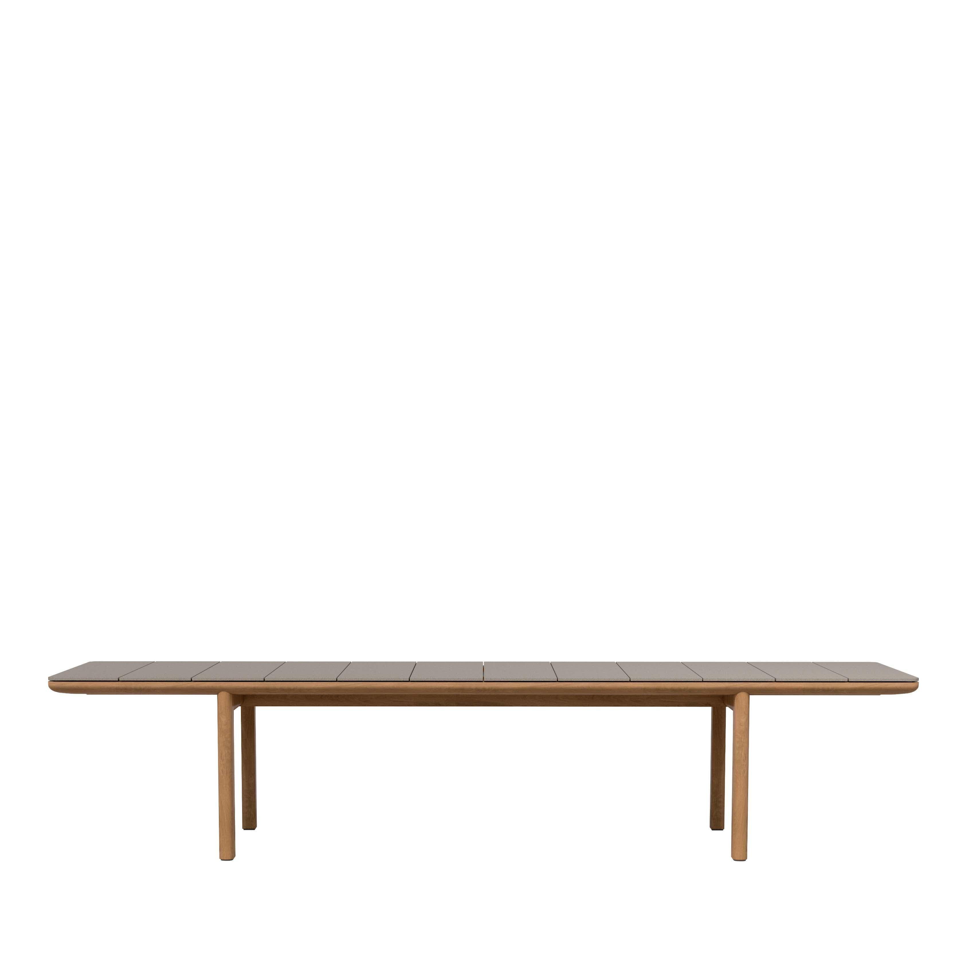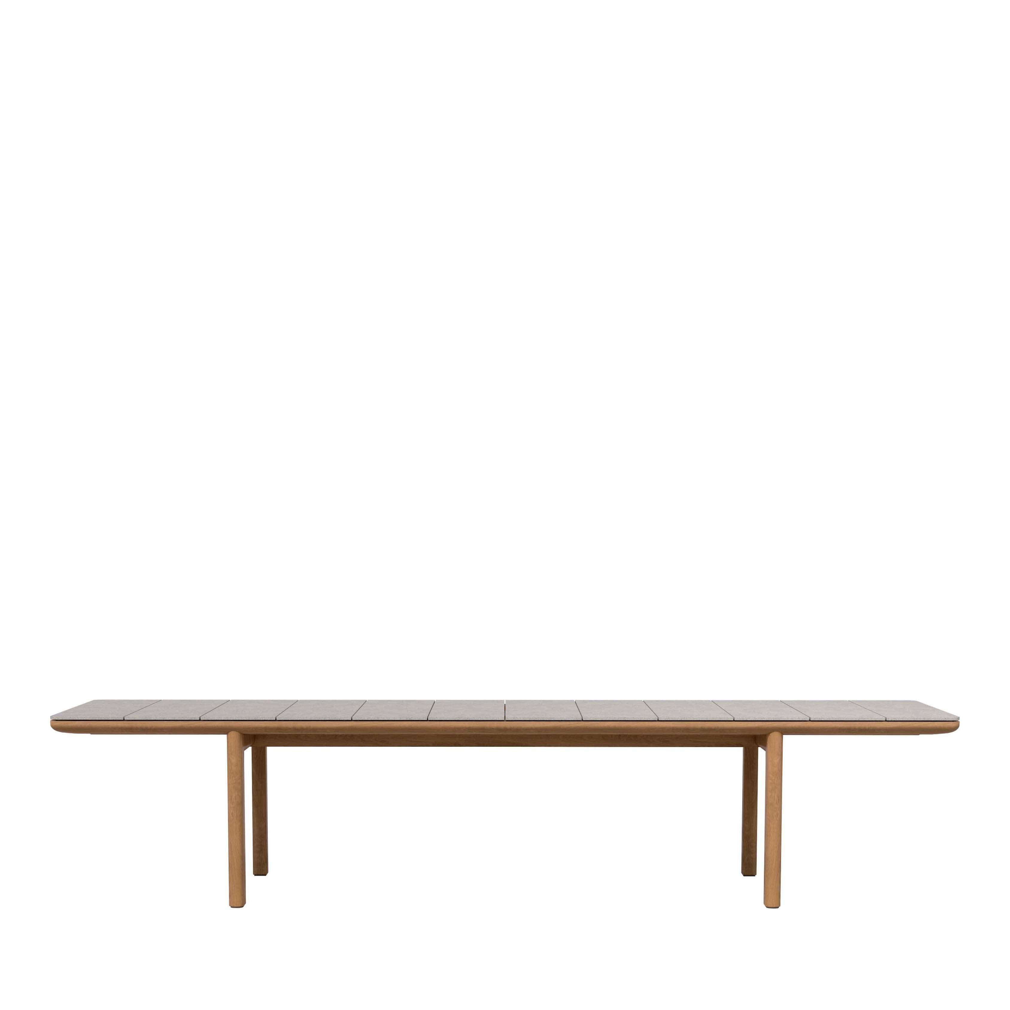 Le plateau de la table est composé de larges carreaux de céramique qui semblent flotter en apesanteur sur le cadre discret mais robuste en teck. Cette conception confère à la table une légèreté aérienne qui séduit tant sur le plan visuel que fonctionnel. Les bords arrondis des profilés en teck et des carreaux de céramique extérieurs contribuent à donner une impression générale de douceur et d'harmonie. Ces formes fines soulignent la simplicité du design, qui séduit néanmoins par sa présence.
