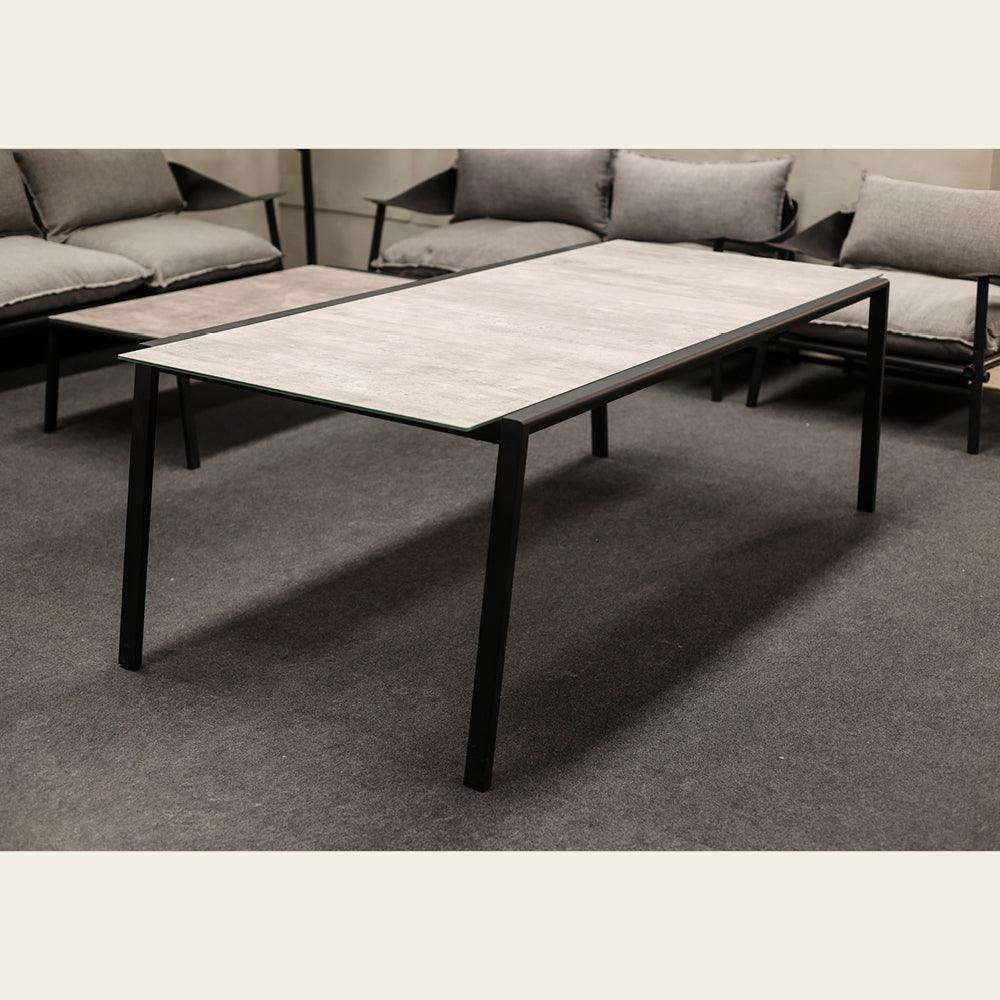 Les dimensions de 220 x 100 x H73 cm font de la Table de jardin LYRA un centre généreux pour les réunions conviviales ou les moments de détente tranquilles. Chaque détail de la table témoigne du plus haut niveau d'artisanat et de l'amour du détail que Brafab met dans chacun de ses produits. Malgré son état d'usure, où le piètement en acier peut présenter de légères rayures, le plateau en céramique reste en excellent état, ce qui souligne la durabilité et la qualité de ce meuble.