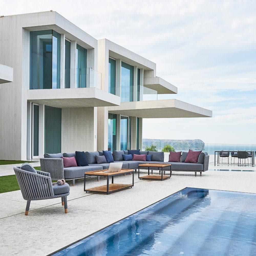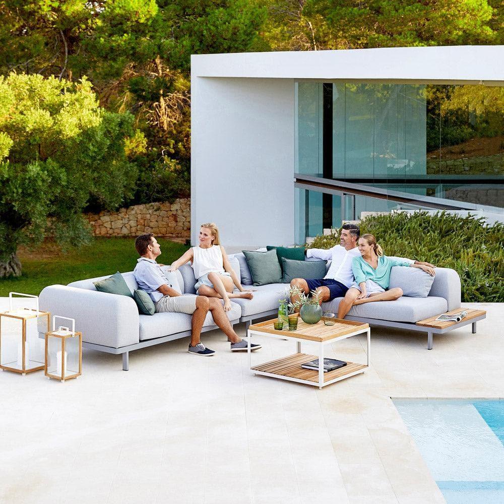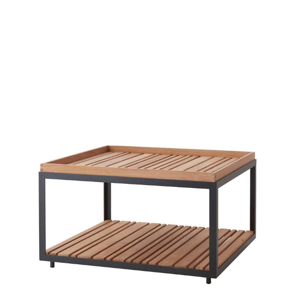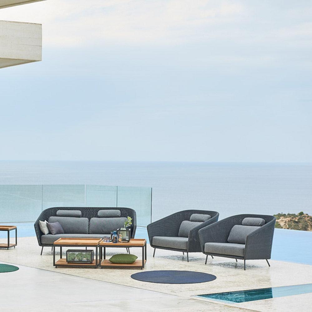 Level est disponible avec un cadre en aluminium thermolaqué gris lave ou blanc et avec un plateau de table en teck certifié ou en béton. Le bois de teck de Cane-line est testé et cultivé selon le système de certification SVLK.