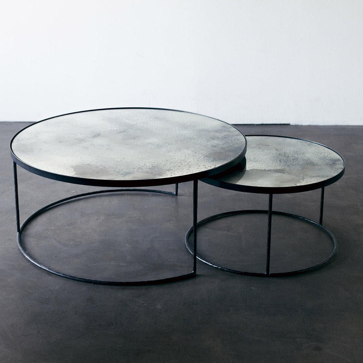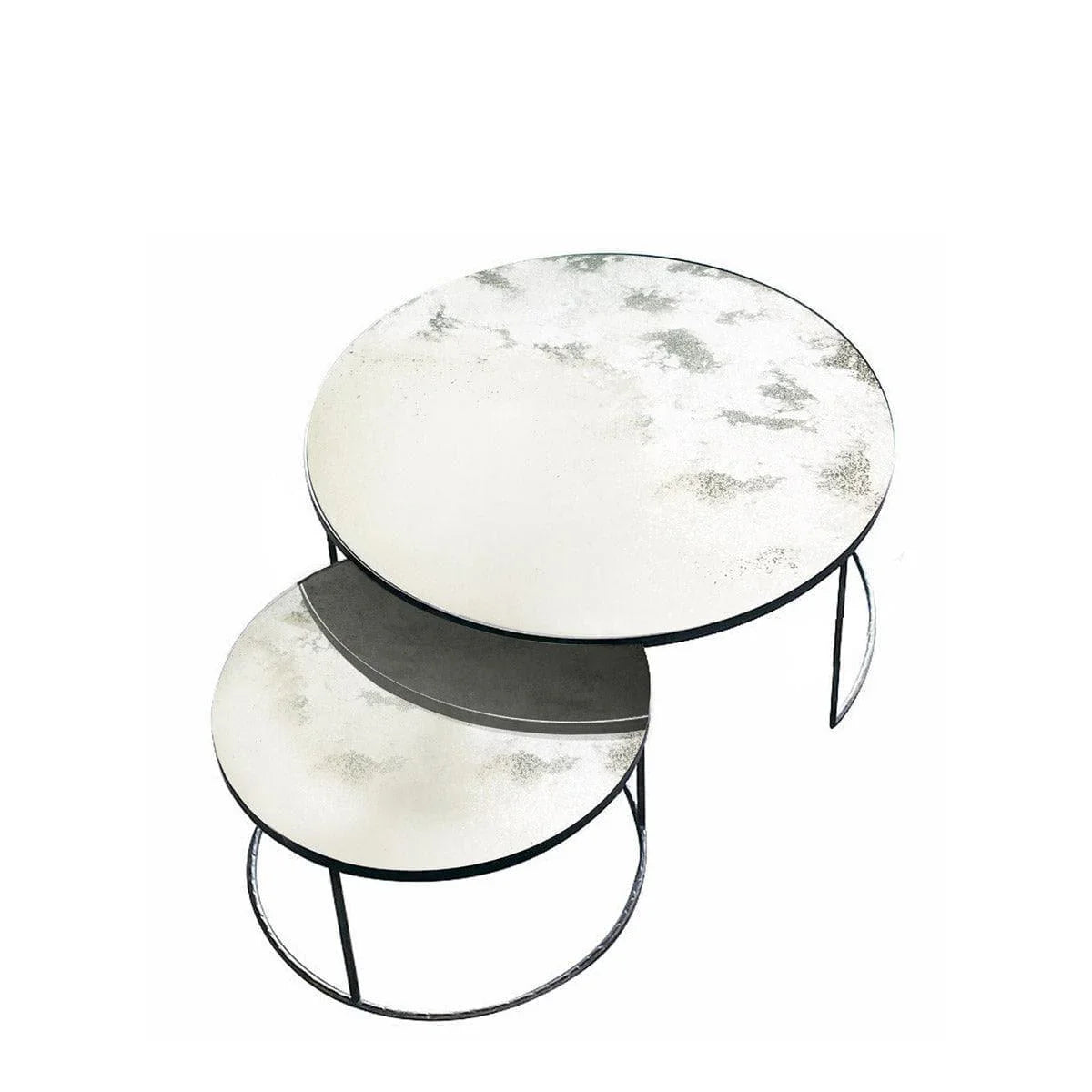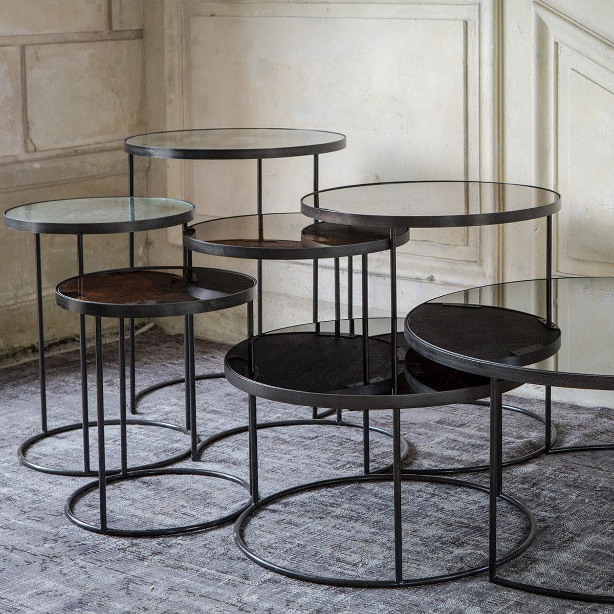 Les pieds filigranes en acier brun foncé patiné par le temps confèrent aux tables un aspect moderne et industriel. Cet élément de design, associé à la surface réfléchissante, crée un lien harmonieux entre le charme vintage et le style contemporain.